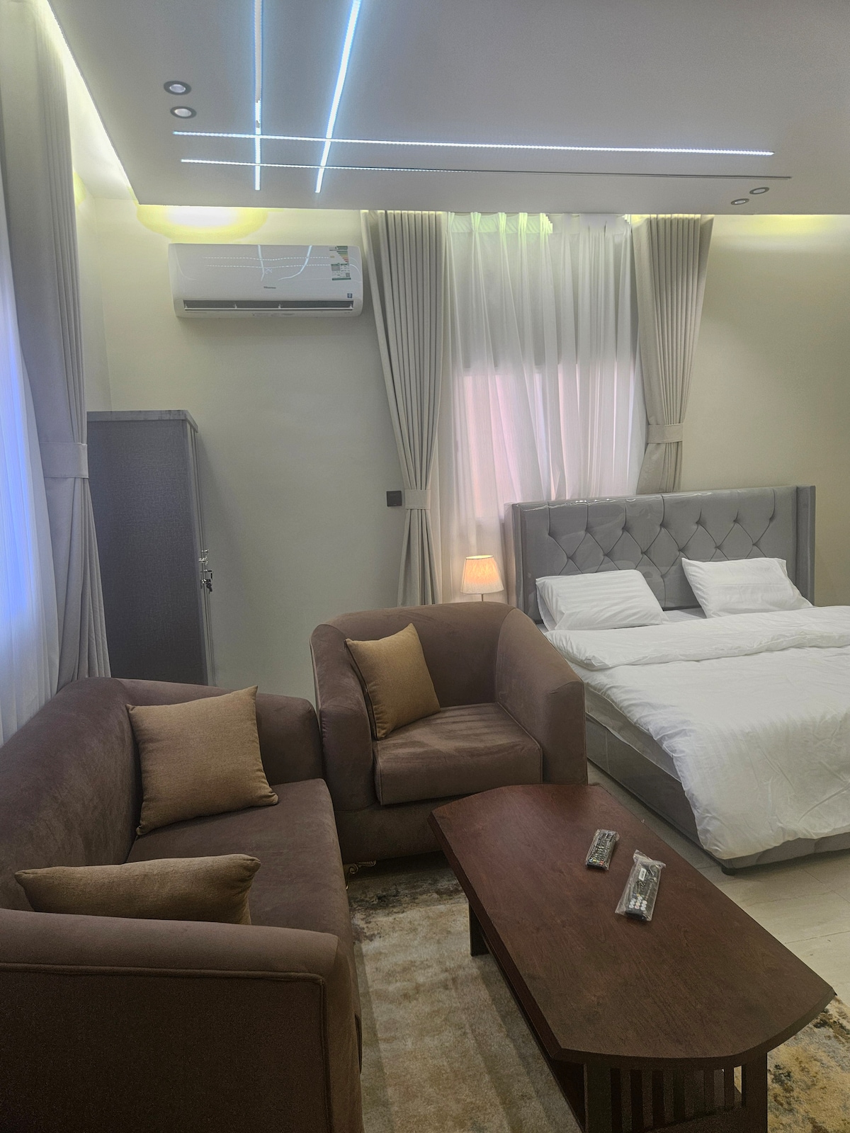 غرفة وصالة فندقية أنيقه وفاخرة بأثاث مثالي للاسترخاء والراحة والهدوء بتسجيل دخول ذاتي تقع بالقرب من الاماكن السياحية موقع مميز جدا تبعد عن المطار ١٥ دقيقة جميع الخدمات حول السكن متوفرة يتوفر نت مفتوح بسرعة 200 ميقا اشتراك شاهد VIP Netflix اشتراك تفاصيل المكان: غرفة نوم بسرير ماستر وجلسة جانبية وصاله بتصميم عصري أنيق وشاشة كبيرة ذكية ودورة مياة بتصميم أنيق ركن لتحضير القهوة بضيافة مجانية متكاملة صممت من أجلك لتلبي جميع مايحتاجه الضيف لتعيش تجربة فريدة ومميزة في مدينة جازان
