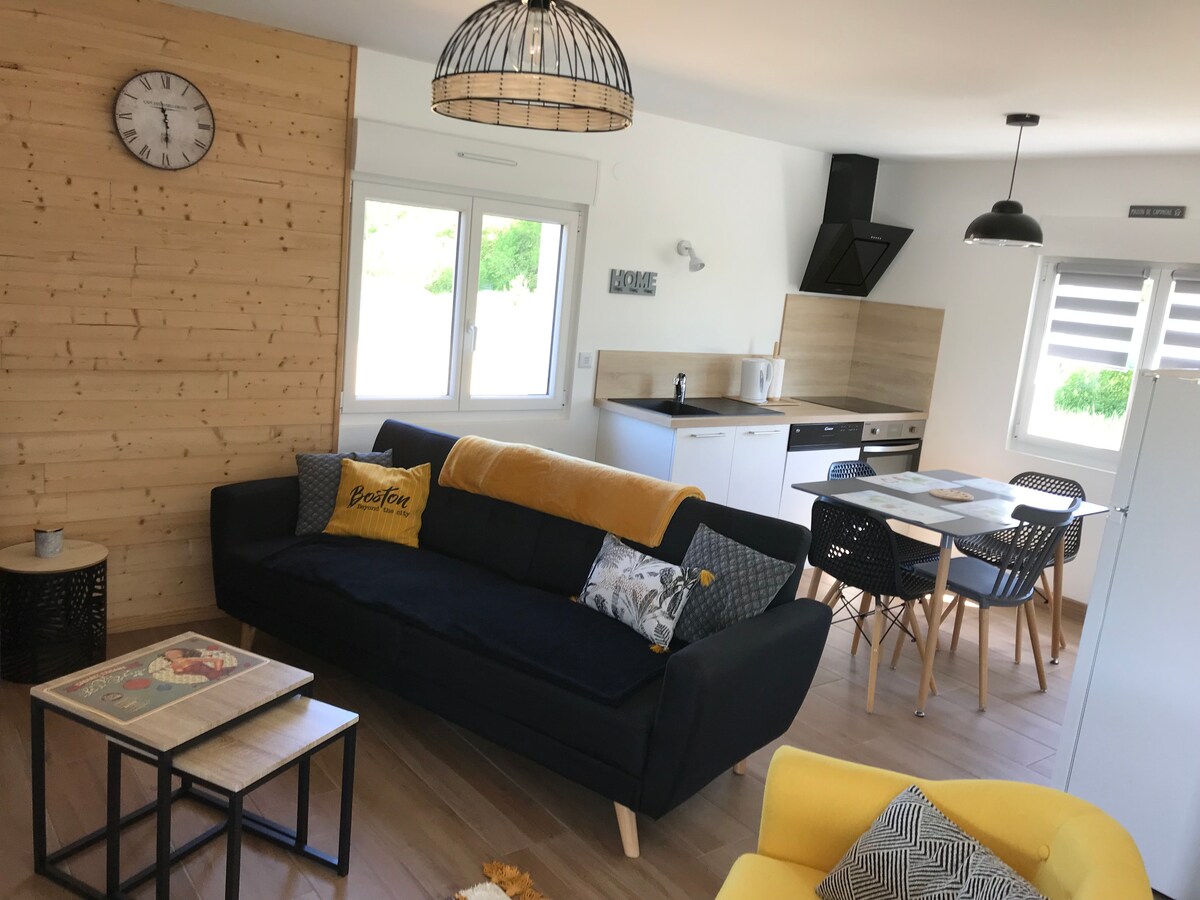 라임스 시내에서 10분 거리에 있는 마을에서 차르틸을 건너면 40평방미터의 독립적이지만 저희 집에 인접한 이 2개의 방으로 들어갑니다. 주방(냉장고, 호브, 미니 오븐, 커피 메이커)이 있는 메인 룸 1개와 소파 베드 1개. 더블 침대 1개, 싱글 침대 1개, 책상 1개가 있는 침실 1개 샤워기와 변기가 있는 욕실 1개. 조용하고 작은 나무 테라스, 정원 전망. 침대. 수건 제공 체크인 시간 등 특별히 요청하시는 사항이 있으면 언제든지 연락주세요.