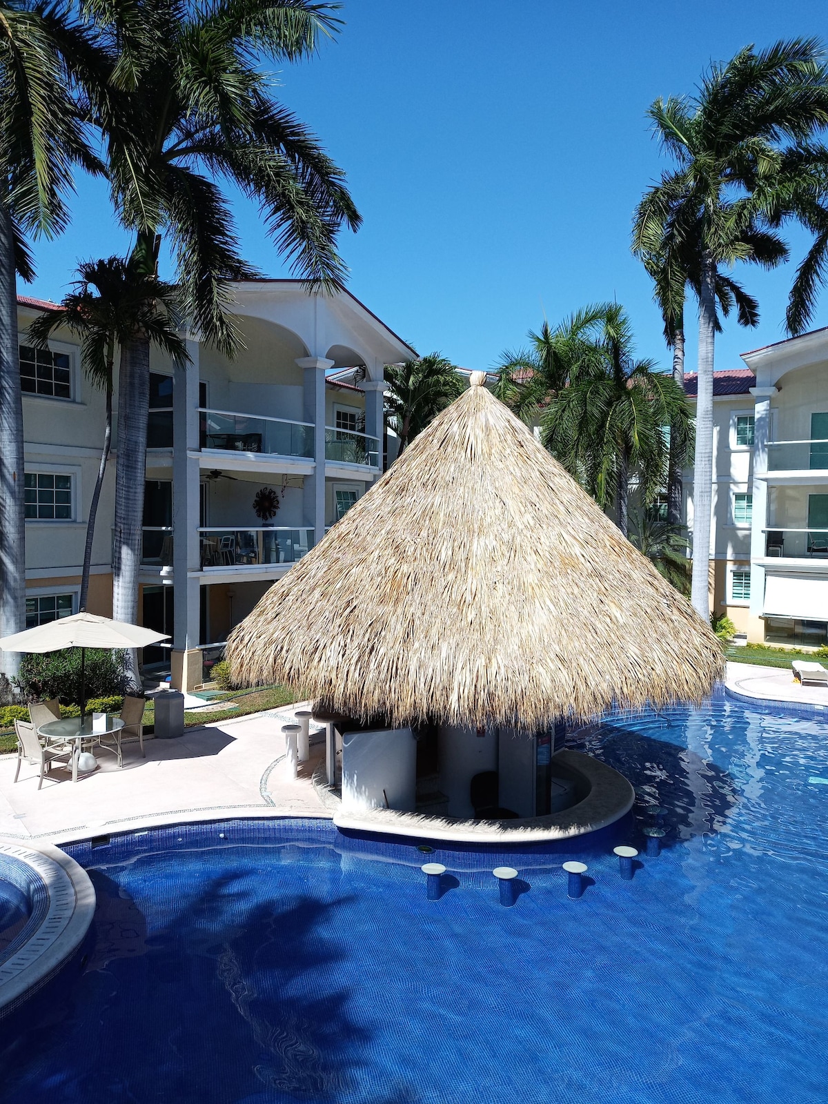 Ground floor apartment with all services and intact interiors after OTIS/JOHN. Huge pool with an amazing garden, private Jacuzzi, 24/7 security, 300 MB WIFI speed, and an equipped kitchen. Your private parking space is a few steps from the door. Located on the main Ave in the Diamante area, 7 min from the Aero and 1.2 km from the beach. 2 BRs and a living room with mini-splits, 2 bathrooms, Bluetooth speakers in the ceiling, a folding desk in the living room with views to the garden.