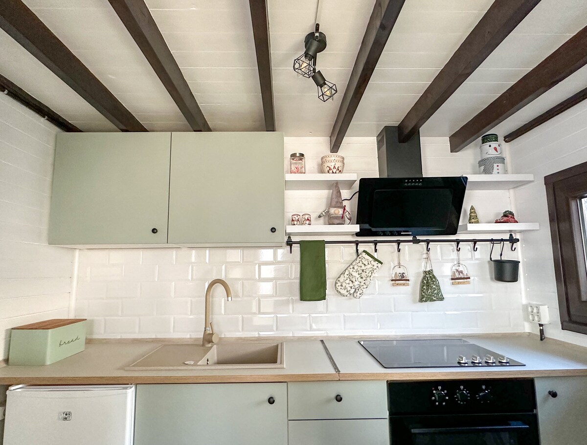 초소형 삼각형 통나무집 커다란 창문이✔️ 있는 밝고 탁 트인 거실 냉장고, 전기 스토브, 후드, 싱크대, 전자레인지, 잡동사니, 주방용품, 커피용 에스프레소 머신, 4인용 식탁이✔️ 있는 작은 주방. ✔️대형 소파 ✔️대형 샤워실이 있는 전용 욕실 ⏩ 1층으로 가는️ 나무 계단 킹사이즈 침대가 있는 전용 침실✖️ 소파가 있는 개방형 휴식 공간(확장 가능) 책이 있는✖️ ✖️작은 도서관 마당에 🔶온수 욕조(추가 결제)