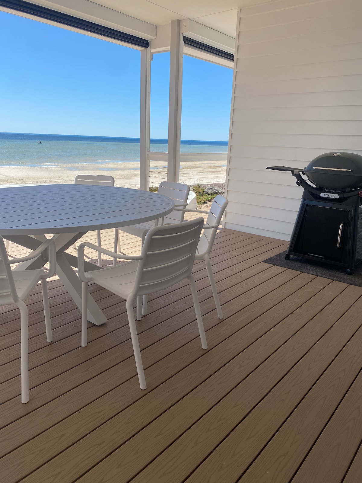 햄프턴에서 영감을 받아 리모델링한 1950년대 해변 숙소에 오신 것을 환영합니다. 저희 대형 침실 1개의 에어비앤비는 아래층에 있습니다. 포트 빅토리아는 요크 반도의 아름답고 독특한 지역에 자리잡고 있습니다. 침실, 거실, 파티오에서 바다 전망을 즐길 수 있습니다. 날씨가 바뀌면 거실 창문 바에서 음료와 간식을 즐기며 전망을 즐기거나 바비큐 공간에서 아늑하게 쉴 수 있습니다.