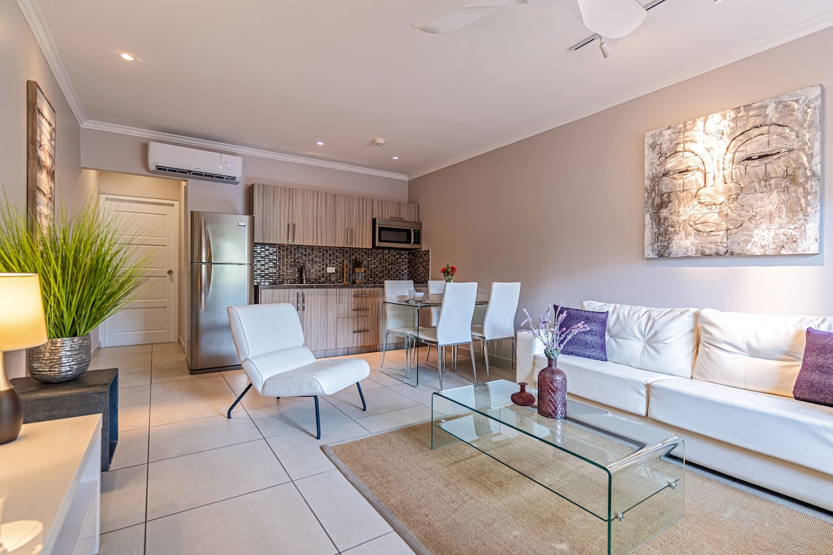 The ultimate loft for guests who value privacy, space, and value. This adults-only studio features a private terrace with plunge pool, ideal for quiet, independent stays. Inside, enjoy a king bed with a 12" memory-foam mattress, a comfortable living area with a 65" HD TV, and an ensuite bathroom with rain shower and hot water. A fully equipped kitchen and dining table support self-guided, longer stays. A curated Aruba guide is included. Private. Simple. Practical.