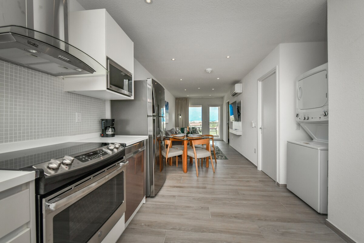 이 아름다운 스튜디오는 아루바의 파란 색을 반영하며 매우 현대적이고 깨끗한 디자인으로 매우 편안한 킹사이즈 침대와 킹사이즈 베개, 완비된 실용적인 주방, 아름다운 워크인 옷장, 스파와 같은 레인폴 샤워기가 있는 현대적인 욕실을 제공합니다. 건물의 가장 높은 층에 위치해 있어 아루바 시내와 항구의 멋진 전망을 자랑합니다! 물과 크루즈선이 내려다보이는 360도 전망과 최첨단 헬스장을 갖춘 인피니티 풀과 옥상 온수 욕조를 즐겨보세요!
