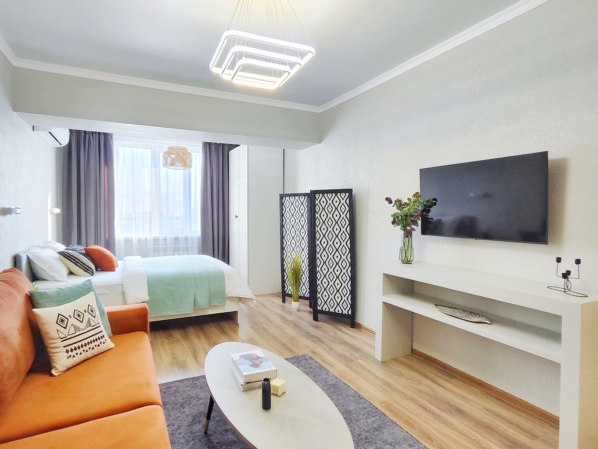 Studio flat of 50m2 with a panoramic window in the new business class residential complex Arbat. The flat has a beautiful view of the city and side views of the mountains. - The flat has Smart TV and means you can connect to your favourite online streaming. - The house is located in the Golden Square, a historic centre and a point of attraction for visitors and residents alike for great walking tours.
