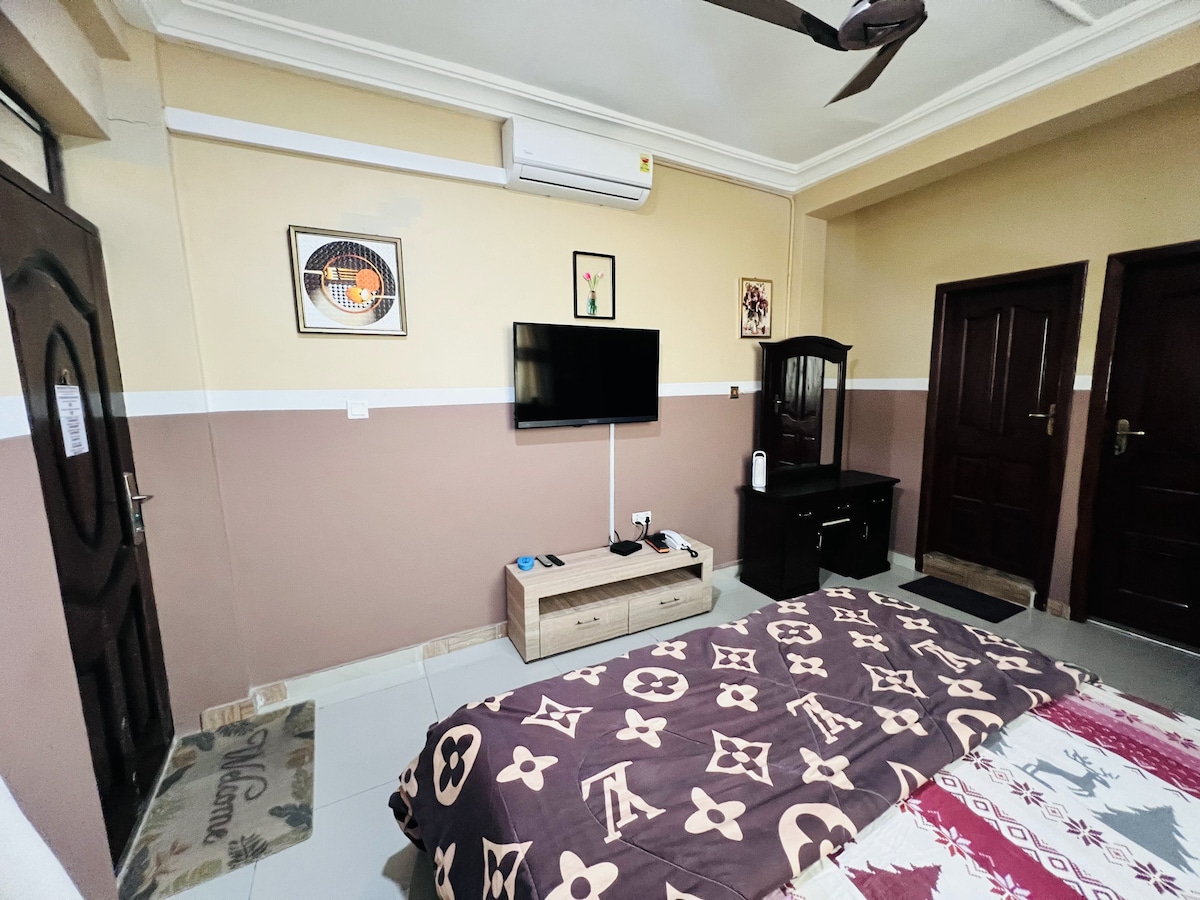 Our brand-new 2-bedroom suite in Kumasi, featuring a luxury en-suite, modern tropical architecture, and prime location just 10 minutes from Kumasi Airport. Enjoy the convenience of private parking, free WiFi, a 55” Smart TV, open kitchen and dining. With a backup power plant, professional team, and 24/7 strict security, your comfort is our priority. Self-check-in with confirmation code adds to the seamless experience. Explore nearby restaurants and shops, or relax at lounge.