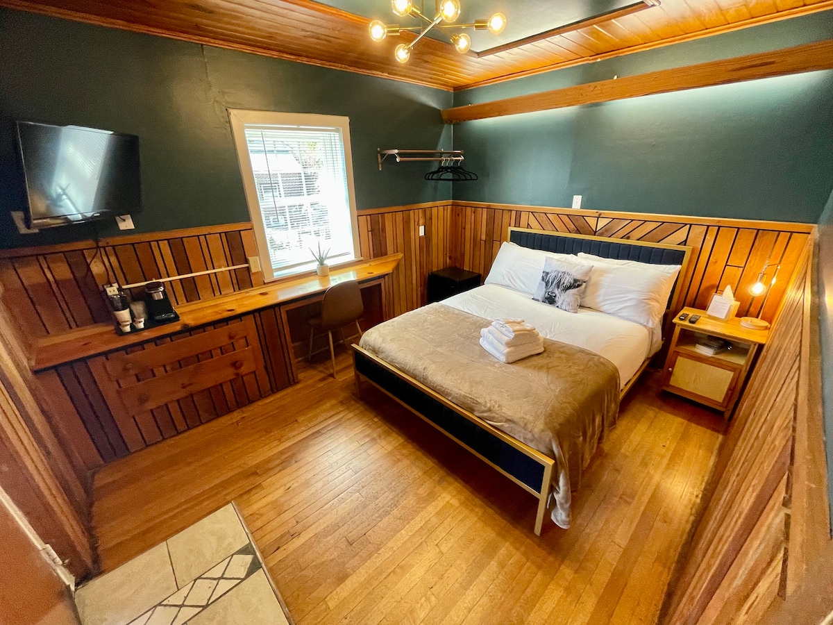 A 1936 Georgian Revival, Peri Social House is NC's Smallest Boutique Hotel. This first floor room has accessible access, a king bed and large bathroom. Spend slow mornings at our public coffee shop or enjoy a nice selection of craft beer, wines and cocktails at the cocktail bar. Walk to charming, downtown Black Mountain and explore the plentiful art galleries, local eateries and beautiful views. Peri means "mountain dweller" and we hope you'll dwell with us!