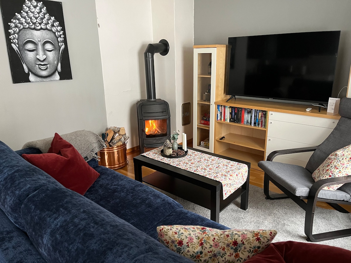 Hjemmekoselig leilighet som brukes av leietaker i sin helhet. Egen inngang, eget bad, soverom og stue med kjøkkenkrok. En god dobbeltseng på soverommet, og en flott furninova sovesofa i stua som kan slås ut til en 160 cm bred seng. Barnevennlig uten trapp. Babystol. Varmekabler i alle gulv, peis og ved. Egen solfylt møblert uteplass. Parkeringsplass utenfor garasjen med mulighet for lading. Det er ca 15 min å gå eller 3 min med buss til Asker sentrum. Fra Asker er det 20 min med tog til Oslo S.
