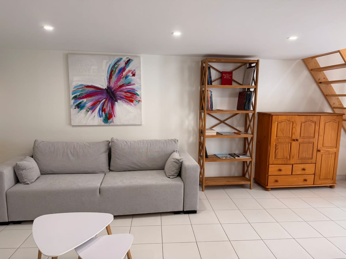 1층에 위치한 넓고 밝은 스튜디오 간이 주방 공간이 있는 독립적인 출입구. 냉장고 오븐 콤비 세탁기 전기 베이킹 탑 2개 무료 와이파이. 전용 욕실. 대나무 쿠틸과 매트리스 토퍼가 있는 침대 160x200 매트리스 (센스) 탄탄한 지원으로 푹신푹신). 더블 침대 1개와 1클릭 클락, 욕실과 화장실이 있는 위층 침실 1개 숙소 바로 앞 무료주차장 조용한 동네 A10 고속도로는 2km 떨어져 있습니다.