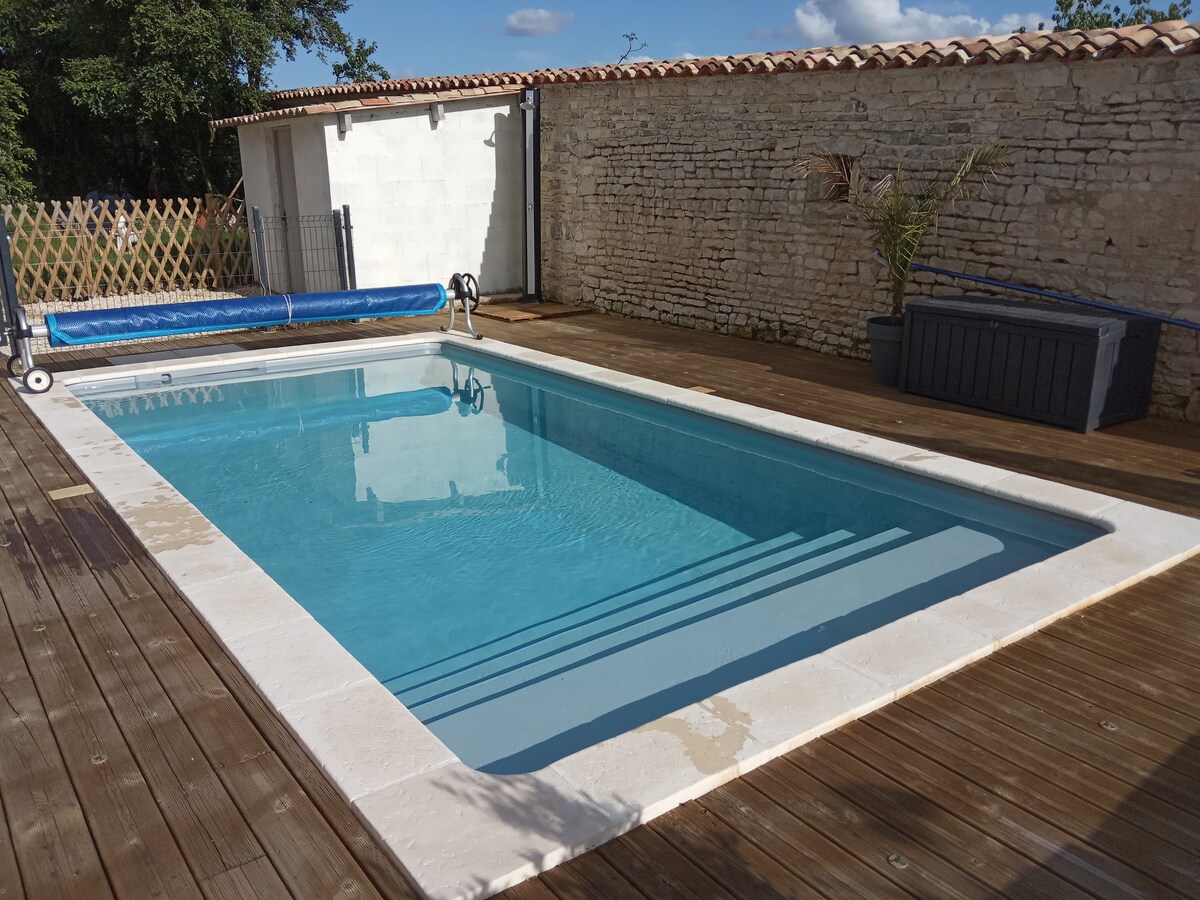 Dans notre maison en campagne, à seulement 12min d'Angoulême, nous vous invitons à séjourner dans l'appartement privatif de 50m2 que nous avions aménagé pour nos enfants, recemment entièrement renové, équipé et décoré avec soin. 2 chambres, 1 séjour/salon/cuisine avec canapé lit et 1 salle d'eau/wc. De juin à septembre, accès libre à la terrasse et à la piscine chauffée ainsi qu'à un espace extérieur repas/détente ombragé privatif. Jusqu'à 6 voyageurs.