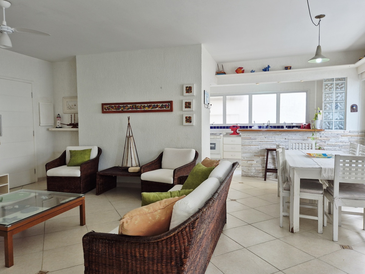 🌴 Beachfront apartment in Guarujá! 📍 Prime location, 🛏️ 2 bedrooms: -1 with a double bed, and one with a bunk bed. 💨 Fans in the living room and bedrooms. WiFi . 🍽️ Kitchen equipped with utensils 🏖️ Beach service included 🍽️ Exclusive restaurant in the building (high season) 🚶♂️ No street crossing, the building is on the sand! 🛍️ Nearby there are: • Market, bakery, restaurants, pharmacy, Guarujá shopping mall 400 m away, there are cinemas 📌 Accommodates up to 4 people.