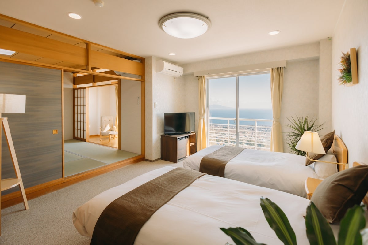 바다 전망 트윈룸, 전용 온천 무료 예약, 버스 정류장까지 도보 10분, 전차 역까지 도보 20분, 다이무슴산과 해안까지 차로 10분
