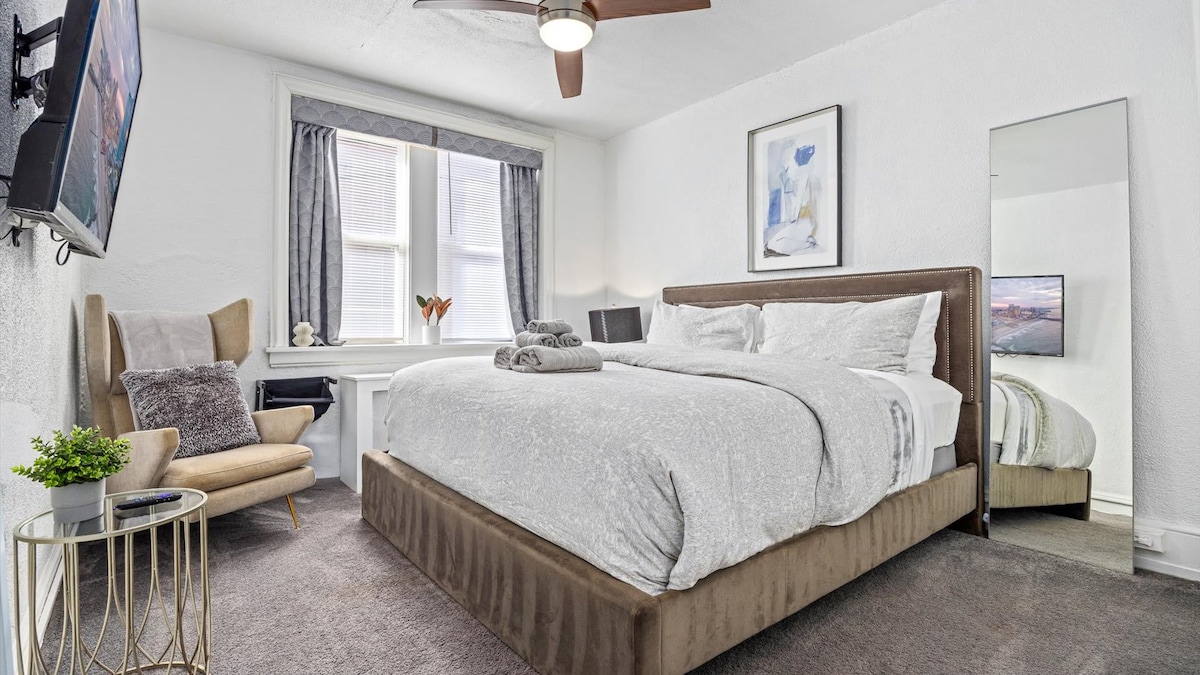 세련된 1베드룸 아파트가 모든 활동의 중심지에 자리한 애틀랜틱 시티의 번잡한 오렌지 루프 동네에서 휴식을 취하고 재충전할 시간입니다. 라이브 음악을 들을 수 있는 그루브를 준비하고, 근처 카지노에서 주사위를 굴리고, 애틀랜틱 시티 비치의 황금빛 모래사장에 발을 담그세요. 모두 도보로 몇 분 거리에 있습니다! 돌아오면 인상적인 525평방 피트의 인테리어가 기다리고 있습니다. 번개처럼 빠른 1.2GB/s 와이파이, HDTV, 푹신한 킹사이즈 침대, 시설이 완비된 주방이 있습니다!