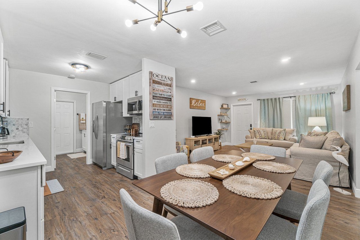 저녁 시간을 위한 카바나의 원격 제어 조명이 있는 데크, 스크린 베란다가 있는 아늑한 수영장 숙소에 오신 것을 환영합니다. 그릴, 열대 과일나무, 식물 및 전용 울타리 마당. 새롭게 리모델링한 공간에서 빈티지 감각을 조합한 해안가 전원주택 장식. 해변, 레스토랑, 골프, 공원, 쇼핑 장소까지 차로 가까운 거리에 있는 평화로운 동네입니다. 각 침실에는 쿨링 매트리스 패드와 천장형 선풍기가 있습니다. 반려동물 환영! 해변용 의자, 쿨러, 자전거, 해변용 파라솔, 수영장 플로트, 요가 매트, 게임/책. 장기 숙박 환영합니다.