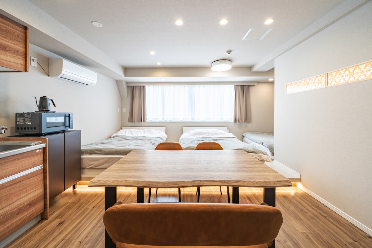 Just 30 seconds from JR/Metro Okachimachi and 5 minutes from JR Ueno, this modern apartment offers easy access to Ueno Park, museums, Ameyoko, and more. Asakusa is 15 min by train, Shibuya 30 min—perfect for sightseeing. Sleeps up to 6 with three double beds, kitchen, microwave, and dining space—ideal for families, groups, and long stays. Warm wood tones and soft lighting create a relaxing retreat. Enjoy mornings in Ueno Park, afternoons at museums, and evenings tasting street food.