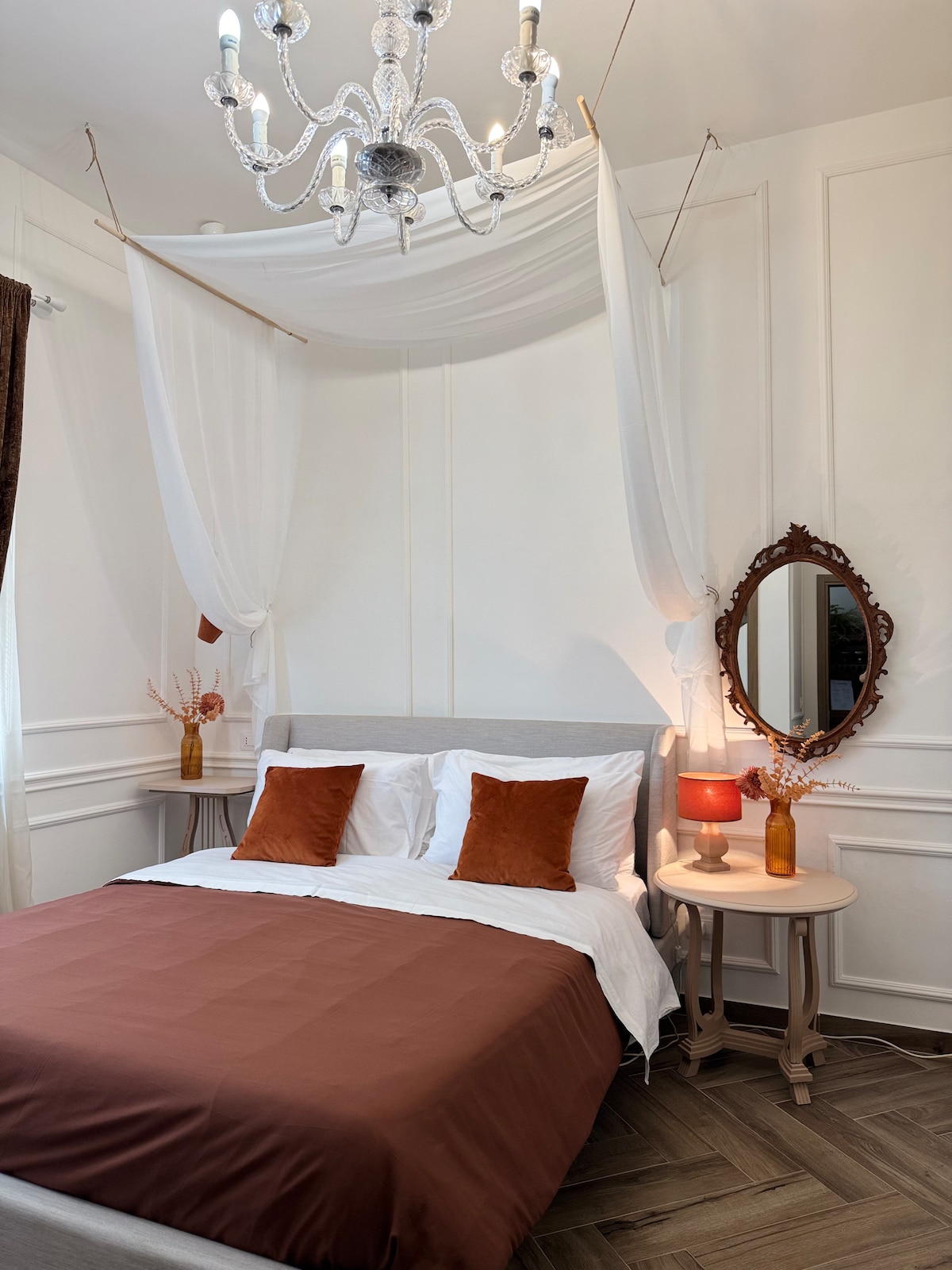 Suite matrimoniale "Minerva" – Una camera raffinata con letto king size per il massimo comfort, dotata di bagno en-suite con doccia, per un soggiorno all'insegna del relax. Possibilità di aggiunta letto singolo vista la spaziosità della suite. Vista sulla vallata , sulle montagne dei monti gemelli e sul parco secolare della villa.