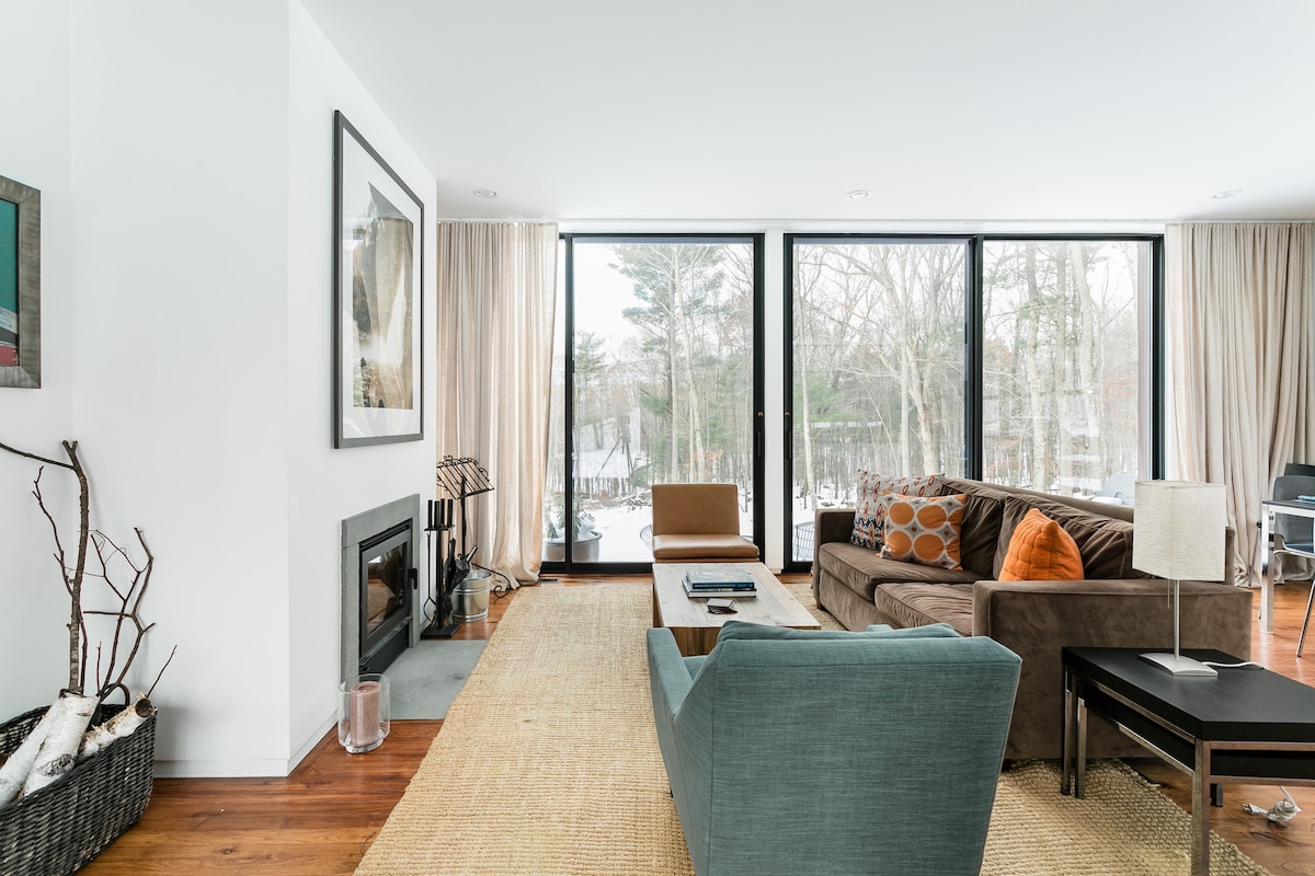 At Stonewall Hill, a modern prefab home set on 10 wooded acres, you can enjoy a cozy night by the fire in winter & cook a feast in the well-equipped kitchen or on the outdoor gas grill in summer. It has an open plan kitchen, living & dining space; a main bedroom w/ queen bed & ensuite bathroom; a 2nd bedroom that doubles as TV room w/ queen sofa bed & bathroom across the hall. 10 minutes to the HITS fairgrounds & close to hiking, skiing, shopping, & dining.