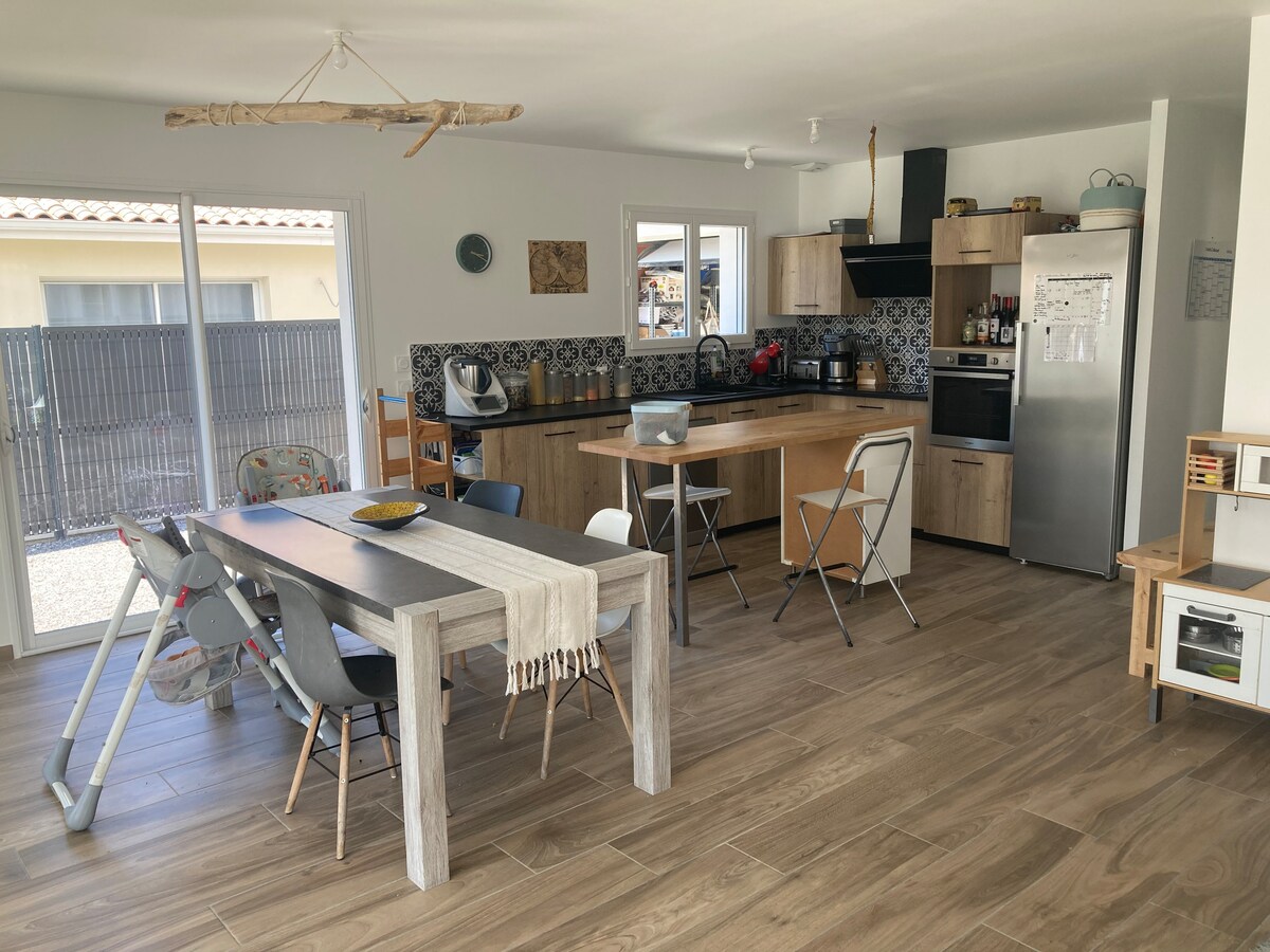 온 가족이나 친구와 함께 조용한 새로운⭐️ 3등급 빌라에서 휴가를 보내세요. 침실 3개 (퀸 침대 1개, 140 침대 1개, 90 침대 2개). 퍼걸러, 수영장, 바비큐 시설이 있는 넓은 테라스가 소나무 숲을 마주하고 있습니다. 자전거 도로로 도심 상점까지 2분 이내에 갈 수 있는 전용 통로. 도보 거리 내에 지붕이 있는 시립 수영장이 있습니다. 바다와 호수로 바로 이동할 수 있습니다. 와이파이, 침구, 수건이 포함되어 있습니다. 전용 주차장 2개