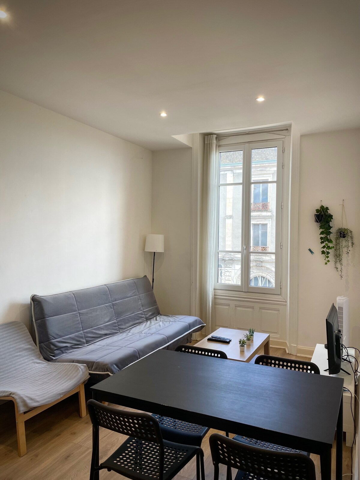 Situé centre ville à 2 pas du square dans une arrière cour au 1er étage avec petite terrasse découvrez ce joli studio entièrement rénové Le logement équipé tout à neuf Cuisine (frigo, plaque de cuisson, micro-ondes, cafetière, grille pain, vaisselle, bouilloire) Lit (140) Tv Wi fi Salle de bain sèche-cheveux Draps et serviettes fournis parking gratuit (foirail 5mn) payant (gravier 2mn) à pied ATTENTION - arrivées des dimanches après 17h - animaux interdits