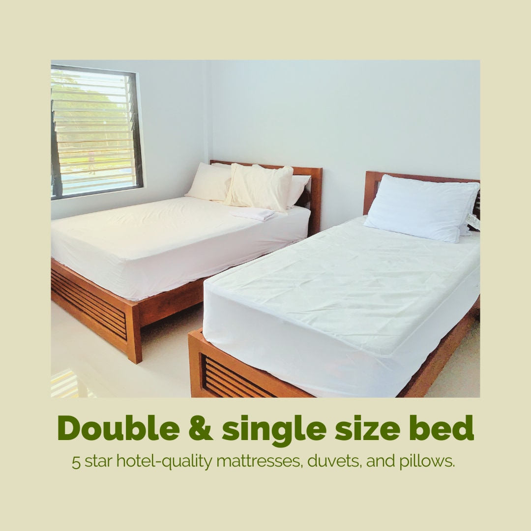 디럭스 풀사이드 빌라는 가족 또는 친구들과 함께 세련되고 프라이빗한 숙박을 즐길 수 있는 공간입니다. 퀸사이즈 침대, 로프트 더블 침대, 소파 베드 2개가 있는 이 빌라는 6~8명의 게스트를 편안하게 수용할 수 있습니다. 두 객실 모두 에어컨, 전용 욕실, 넷플릭스가 구비된 TV가 있습니다. 발리에서 영감을 받은 열대 정원의 수영장에서 몇 걸음 거리에 있는 이 빌라는 발레르의 조용하면서도 경치가 좋은 곳에 자리 잡고 있으며, 서핑 명소, 폭포, 관광지와 가깝습니다.