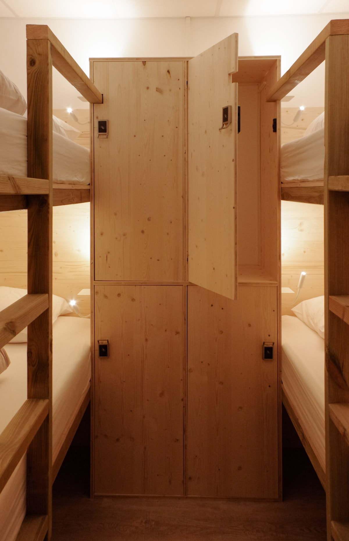 Ici, chambre partagée rime avec intimité ! A réserver par unité sociale, notre dortoir de 4 personnes est équipé de 2 lits superposés douillets et d'une salle de bain privée. Nos lits superposés, conçus et construits par l'équipe de Quartier Libre ont été pensés pour s'adapter aux besoins des adultes : une grande couchette avec rideaux occultants, prise et lumière individuelle.