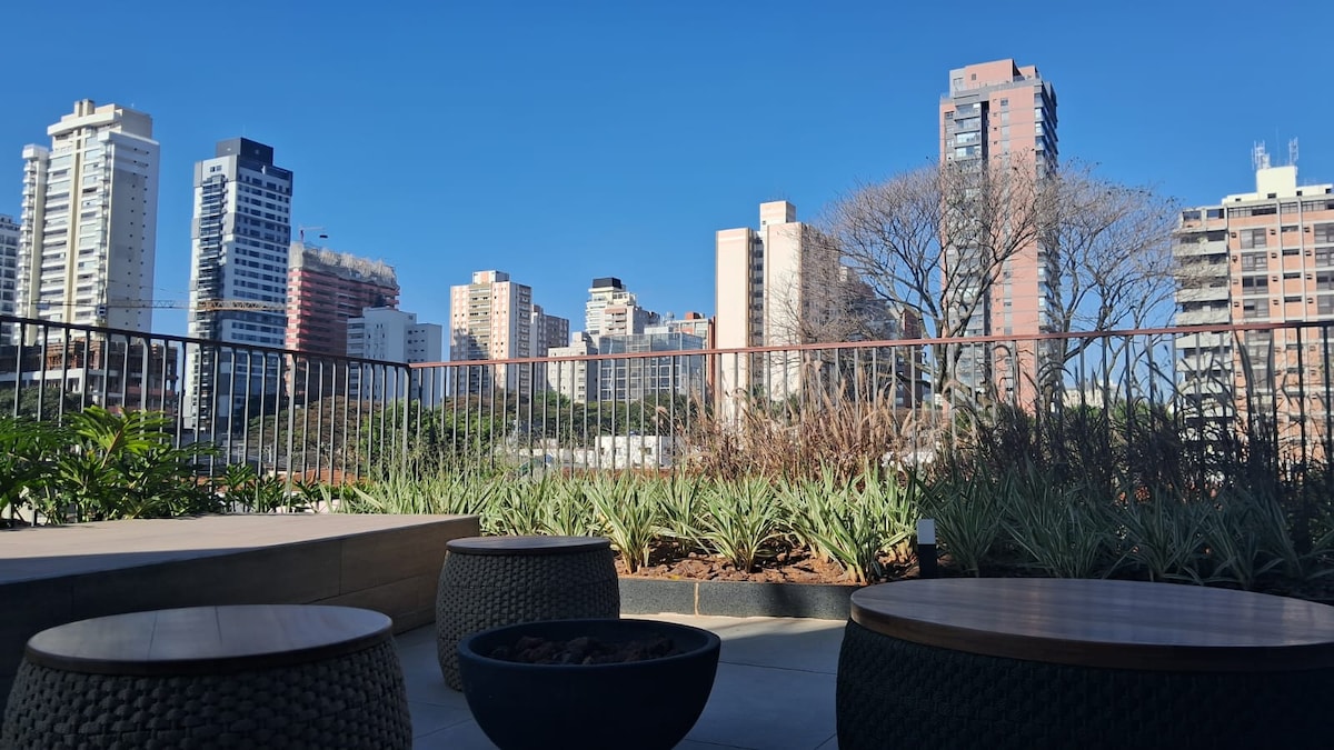 새로운 스튜디오로, 매우 잘 꾸며져 있으며 숙박에 필요한 모든 편의시설이 갖춰져 있습니다. 완전히 자동화되고 편안하며 아늑합니다. 수영장, 헬스장, 바, 공동 작업 공간, 세탁 및 자전거 보관 시설이 있는 현대적인 건물입니다. 광장의 녹색 전망을 감상할 수 있으며, 거리는 조용하고 접근성이 좋습니다. 모에마, 브루클린, 빌라올림피아 지역 사이에 위치해 있으며 쇼핑 이비라푸에라에서 5분, 콩고냐스 공항에서 15분 거리에 있습니다.