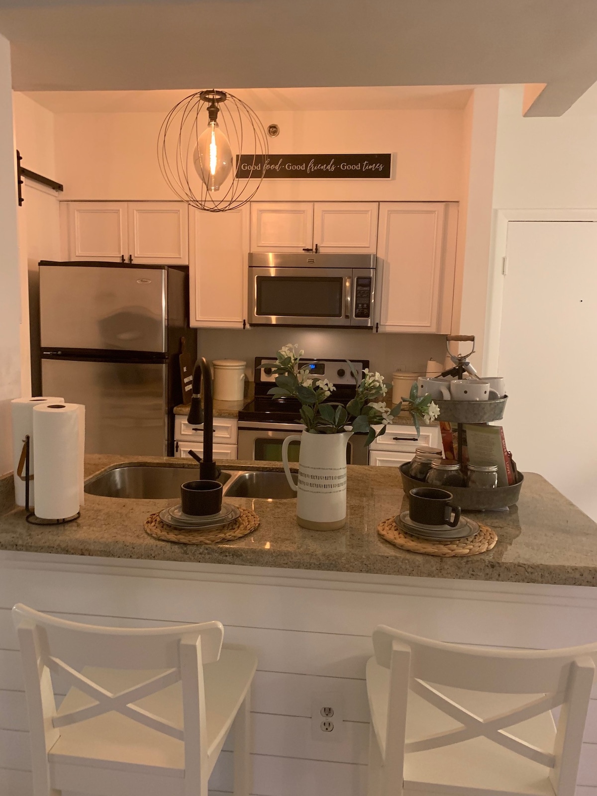 아늑한 침실 2개, 욕실 1.5개의 타운하우스에 오신 것을 환영합니다! 킹사이즈 침대가 있는 넓은 마스터 침실과 퀸사이즈 침대가 있는 두 번째 방이 있으며, 둘 다 위층 욕실을 공유합니다. 수면 공간을 추가할 수 있는 여분의 소파가 준비되어 있습니다. 아래층에는 편안한 거실, 시설이 완비된 주방, 편리한 반신욕을 즐기실 수 있습니다. 미닫이문을 지나면 전용 뒷마당이 나옵니다. 세탁 시설은 위층에 있으며, 현장 주차장이 포함되어 있습니다. 편안한 숙박에 완벽합니다!