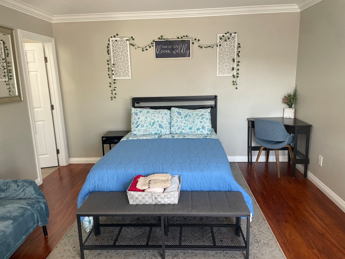 저희 집 뒤편에 전용 출입구가 있는 조용한 스위트에 머무르게 됩니다. 완벽한 프라이버시를 위해 양쪽에 잠금 장치가 있는 안전한 문이 있는 공용 벽이 있습니다. 침실 1개, 욕실 1개의 스위트에는 에어프라이어/토스터 오븐, 전기 프라이팬, 핫플레이트 2개, 전자레인지, 냉장고, 식기세척기가 구비된 주방이 있습니다. 풀 사이즈 소파 베드로 2명이 잘 수 있습니다. 거실에 있는 이 소파 베드는 추가 수면을 제공합니다. 트윈 사이즈 에어로 베드도 제공해 드릴 수 있습니다.