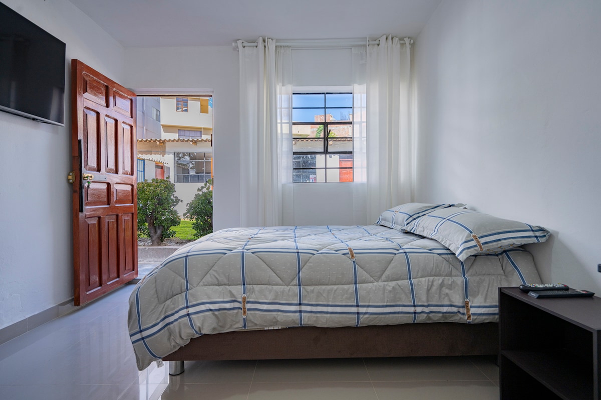 24시간 온수가 나오는 전용 욕실이 있는 1층 숙소의 개인실입니다. 중심지의 안전한 주택가에 위치하고 있습니다. 아르마스 광장에서 도보로 15분 거리에 있습니다. 편안한 싱글 침대 2개가 있습니다. 다른 게스트와 공유하는 1층의 시설이 갖춰진 주방과 식사 공간을 이용할 수 있습니다. 헤어드라이어, 케이블 TV가 있는 스마트 TV, 인터넷 200MB가 있습니다. 1층에 있는 숙소 내부에서 세탁기, 건조기를 사용할 수 있습니다. 시장, 상점 근처. 주차장이 있습니다.