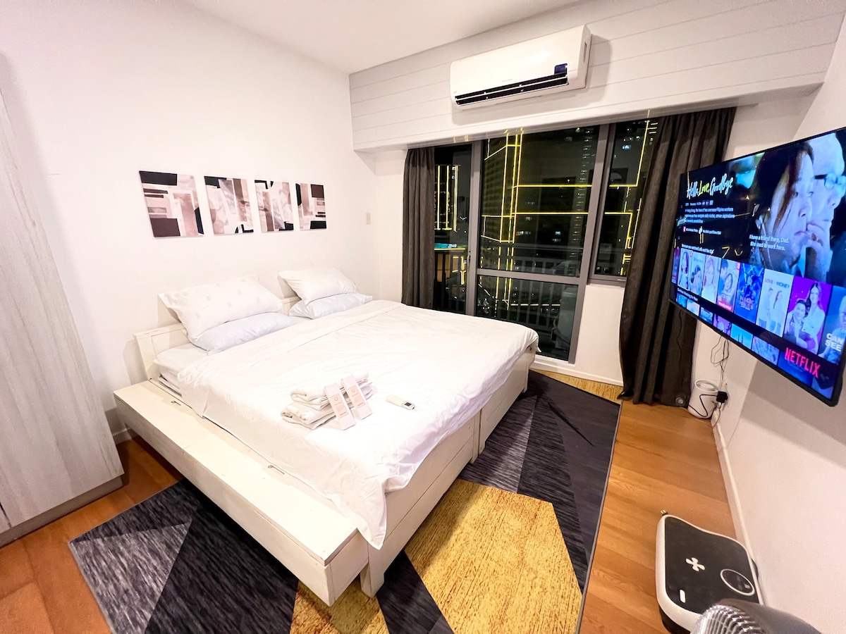 Escape to a high-floor suite with breathtaking BGC skyline views, cinematic JBL surround sound, and a 55-inch Full 4K Smart TV with LED mood lighting—your ultimate movie night haven. Take in the scenery with high-grade binoculars, then sink into the ultra-comfy Emma® Cloud-Bed for a perfect night’s sleep. Far from city noise yet close to everything, enjoy fast WiFi, Netflix, Disney+ and more! Truly a fully equipped space for a seamless, unforgettable staycation experience with Cinema 27!