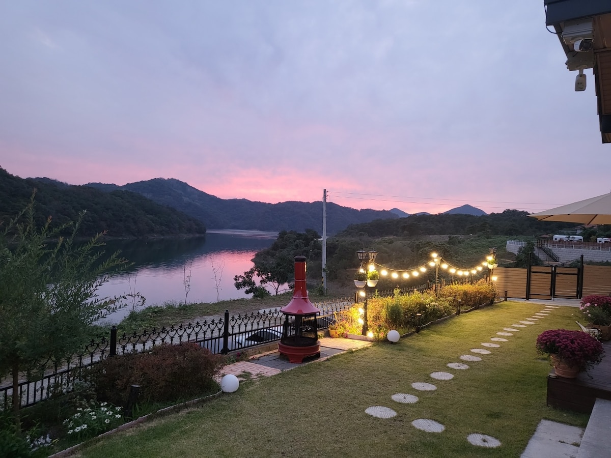 (독채)더 머물다 IC 에서 2분 논스톱 캠핑동선 탁트인 뷰 바베큐와 낭만불멍 감성 펜션