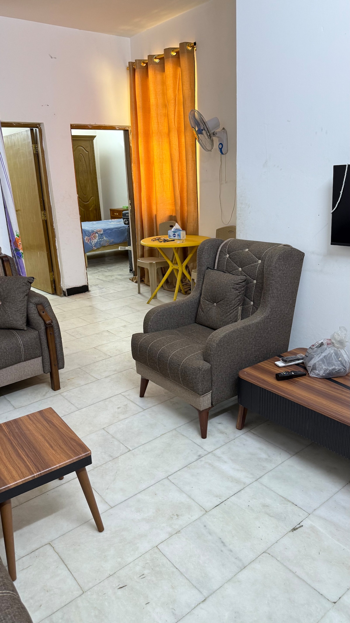 City center charm! Queen bed oasis w/ single option, heart of Mansour. Walk to shopping malls, cafes & more. AC chills, compact kitchen fuels. Modern nest near public transport. Unwind on comfy sofas, wash & stay. Your downtown Baghdad