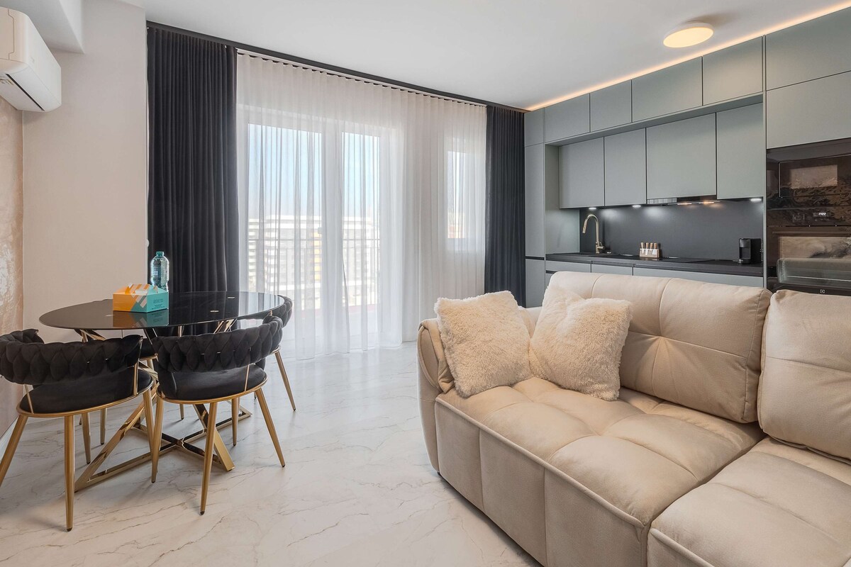 Experience stylish city living in this centrally located studio at the footsteps of Oradea most famous Mall. With unique decor and premium finishes, it features a super-comfortable king-size bed and an open living area separated by a decorative wall. Enjoy the flat-screen TV, fully equipped kitchen, and a balcony with city views. The spacious walk-in shower adds luxury to the bathroom. Cleverly designed, this compact yet elegant space offers everything you need for a memorable stay!