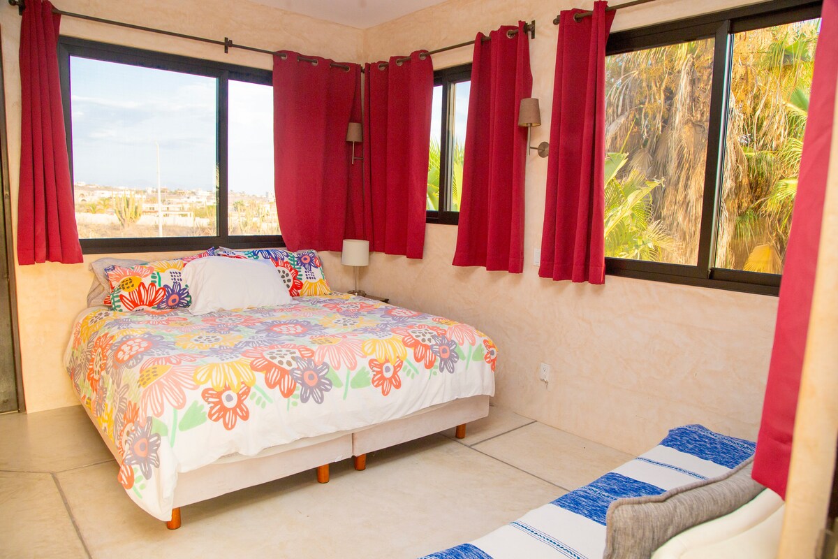 Sustainable dwelling for two to six people looking over the mountains, blending with nature's beauty and its spectacular views of the desert, La Ventana bay and its unique flora and fauna. Just minutes to kite surf, beaches and restaurants. The bioclimatic design with all the amenities and starlink internet, ensure a year-round place to get inspired, to work and to foster togetherness. Welcome!
