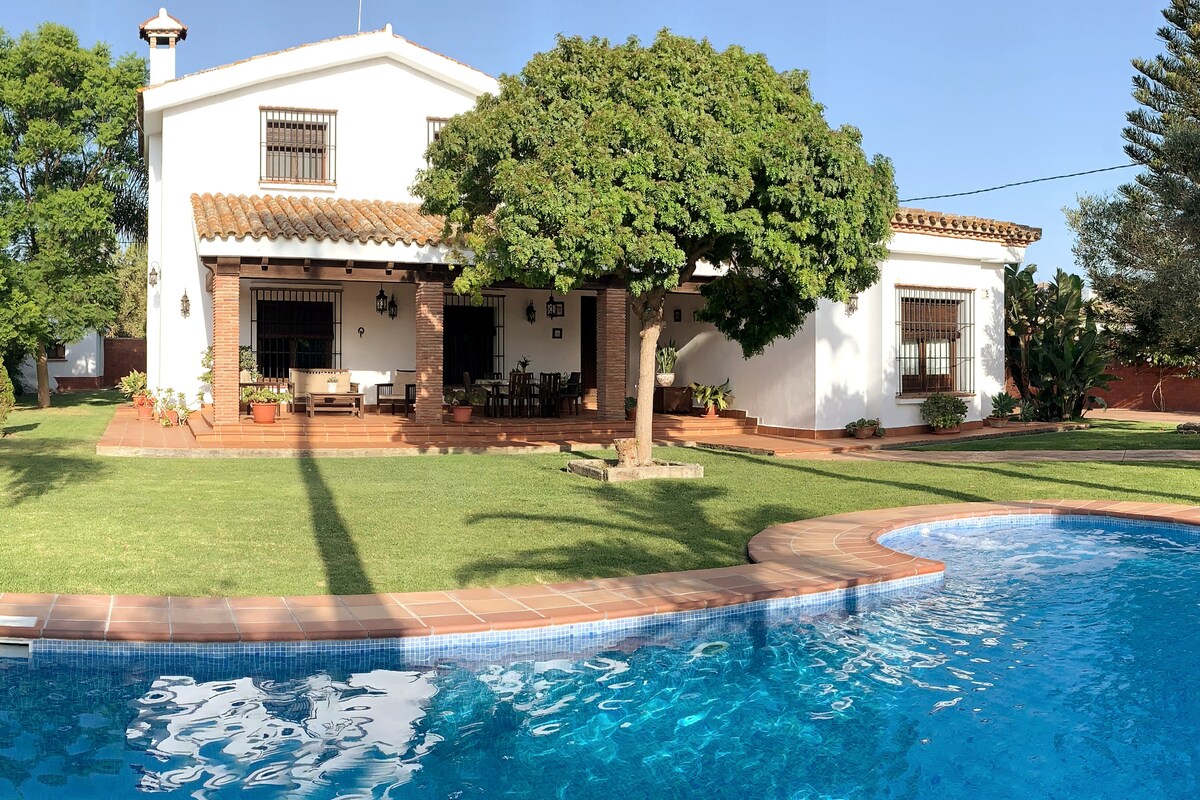 Villa de lujo independiente con sello de calidad "Excelencia Turística Andaluza" para 13 personas, con piscina privada, zona barbacoa, grandes jardines, parking dentro de la vivienda, mesa de billar, ideal para familias con niños, a 5 minutos en coche de la playa, a 5 minutos del centro para tapear, y a 15 minutos campo de golf. Se aceptan mascotas. Número de registro de alquiler asociado al ESFCTU0000110100002432040000000000000000VFT/CA/106140.