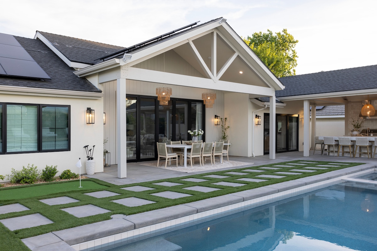 조용한 동네의 산책로 끝에 위치한 이 숙소는 야외 활동을 즐기는 사람들을 위한 천국입니다. 뒷마당에는 잔디밭과 트램펄린, 달리기 공간이 있습니다. 지붕이 있는 파티오에는 천연 가스 그릴, 식탁, 화덕이 있습니다. 울타리로 완전히 둘러싸인 온수 수영장과 자쿠지도 있습니다. 침실에는 각각 스마트 TV가 구비되어 있습니다. 편의시설이 많습니다!! 내 집처럼 편안한 숙소입니다. 기업 및 비즈니스 숙소에 대한 할인 혜택이 제공됩니다. 메시지를 보내주세요!