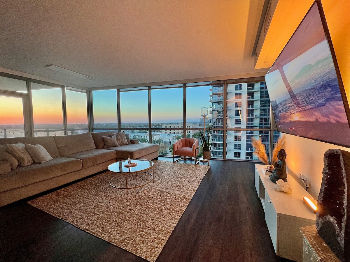 Penthouse luxury highrise with sunset & skyline views and a wrap around balcony. Perfect for couples, families, remote workers and group trips to Southern California. Located in the heart of Orange County, just minutes from John Wayne airport, luxury shopping and restaurants. Our light filled 2 bedroom/2 bathroom is your home away from home. The Chef’s Kitchen is complete with Stainless Steel Viking Appliance, pots, pans & bakeware. The building amenities includes a pool, clubhouse, spaandgym.
