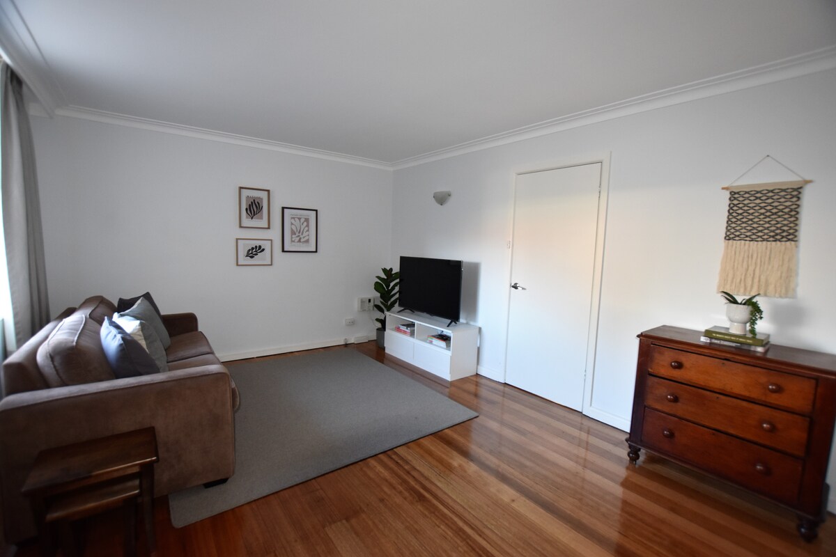 Welcome to our cozy and central 1-bedroom unit(street level) a few minutes walk to the Ballarat Library, hospitals, train station, a supermarket, cafes & the CBD. Beautiful Lake Wendouree is within walking distance. Our tidy kitchen has an oven, microwave, kettle, toaster, refrigerator & other amenities to whip up or heat up a meal. Our compact shower area also has a washer & dryer. We hope you enjoy our comfy & happy little home as much as we do. Welcome to charming Ballarat!
