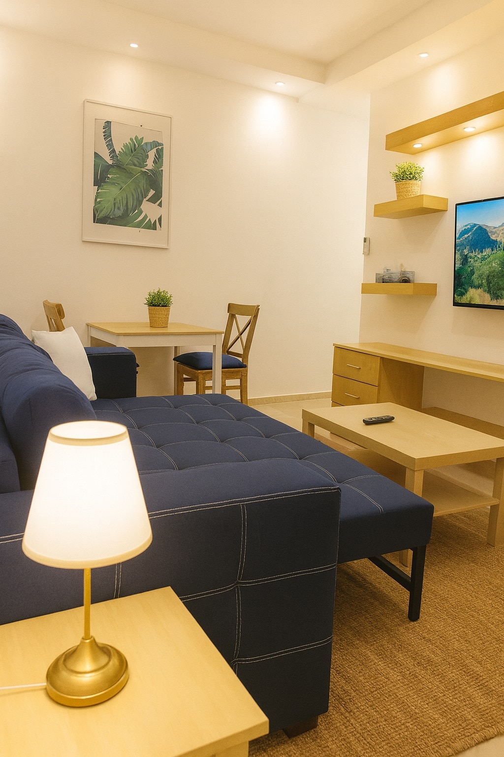 Furnished 2 Bedroom Apartment near US embassy. A modern looking 100 sqm open space 2 bedroom apartment in one of Amman's excellent locations. Full kitchen (fully equipped) and very suitable for long stay. The apartment is in a lively neighborhood and is walking distance from the US embassy. Cleaning service during stays is available at an additional charge.