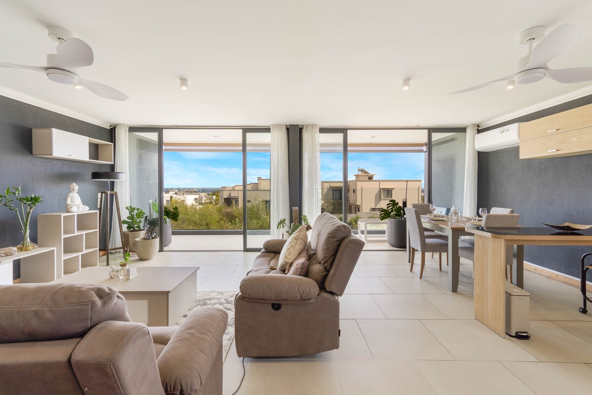 대형 현대 디자이너 빌라에 있는 나만의 전용 시설이 잘 갖춰진 최상층 스위트. 전용 고층과 별도의 야외 출입구를 통해 완벽한 프라이버시를 누리세요. 독특한 바닥 욕조에서 휴식을 취하며 바다, 수도, 산의 멋진 파노라마 전망을 감상하세요. 모든 공용 편의시설(메인 주방🍳, 헬스장💪, 수영장🏊♂️, 거실🛋️, 자쿠지 ♨️ (온수 €10), 주차장)도 무료로 이용하실 수 있습니다🚗.