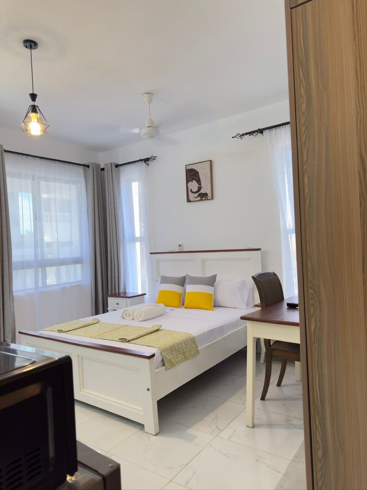 Ideal for short-term stays in the coastal city of Mombasa, Kenya 🇰🇪 The Studio apartment is designed to offer utmost serenity. You can catch a glimpse of the distant sea line through the window with a better view at the roof top. Whether on holiday or work trip or both, its conveniently located and easily accessible with ample parking. The apartment is near Kenya's 🇰🇪 premium beach hotels 🏨 in Shanzu area. Its a walking distance (500meters) to the beach ⛱️ and the blue-sky ocean 🌊