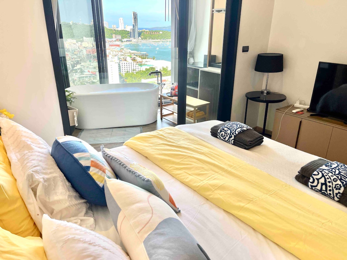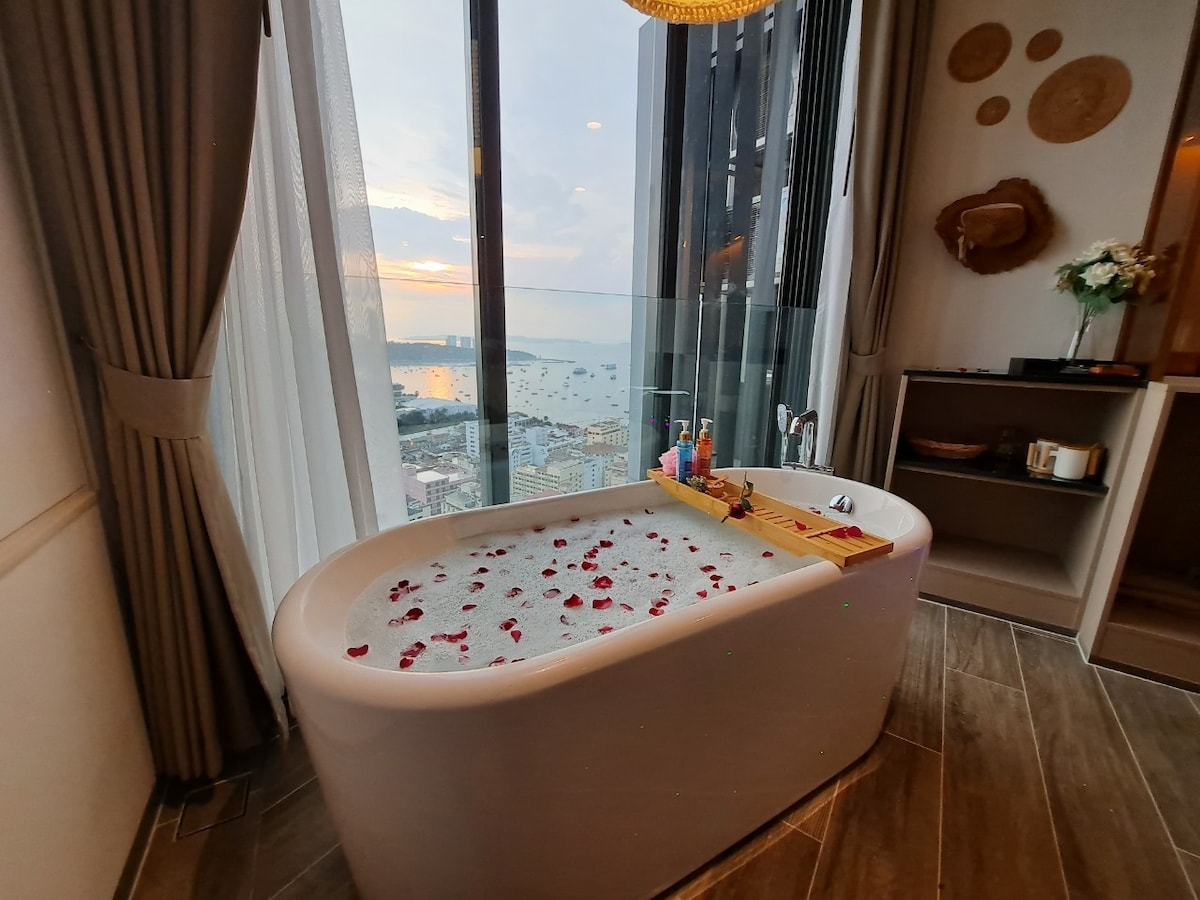 CELEBRATING YOUR LOVE at *THE LOVE NEST SUITE" MY HIGHEST FLOOR SUITE IN PATTAYA WITH BATHTUB OVERLOOKING PATTAYA BAY. Equipped with night star shining gadget for "Under The Star Intimacy Experience" 1 BEDROOM SEA VIEWS ON HIGHEST FLOOR, 1 LIVING ROOM, 1 BATHROOM, 1 KITCHEN IN-ROOM WIFI ROUTER. NO SHARING WITH OTHER APARTMENTS -2 roof top swimming pools , best condo gym in Pattaya -300m walks to Pattaya beach and shopping centers - 5 mins walk to Soi Bua Khao -10 mins walkto Walking Street