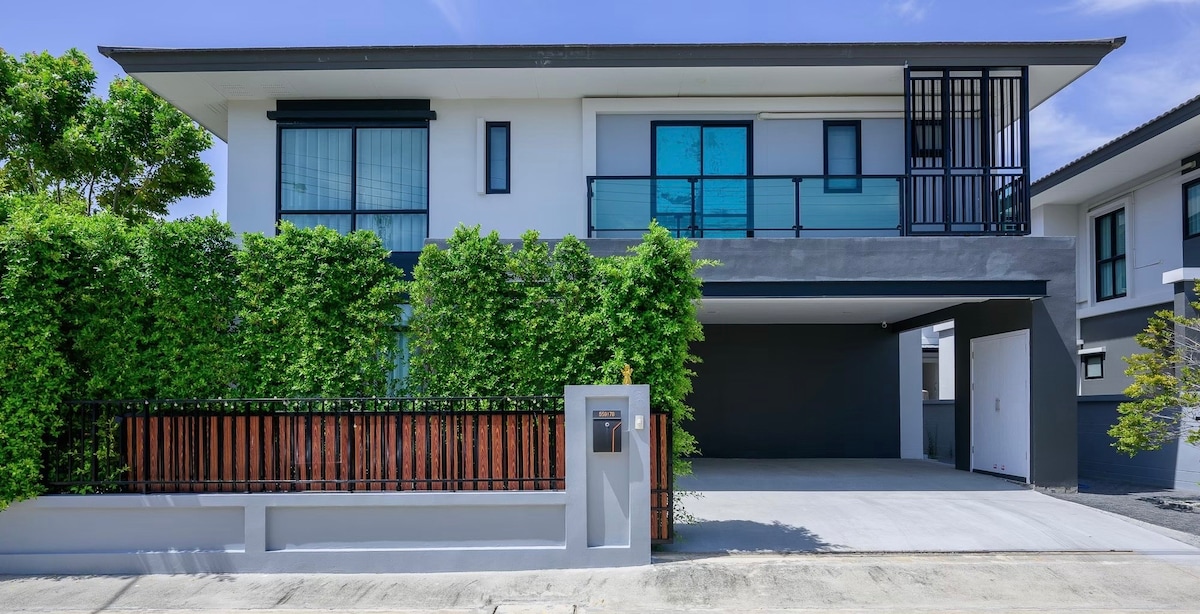 Modern style house located near Suvarnabhumi Airport, approximately 25 minutes drive. The house has 2 floors, 2 bedrooms, 3 bathrooms, a living room with a sofa where you can watch movies and can accommodate 4 people, and 2 kitchen style are Thai kitchen and Island counter kitchen that can be used independently. Please feel relaxed with your whole family in this quiet retreat.