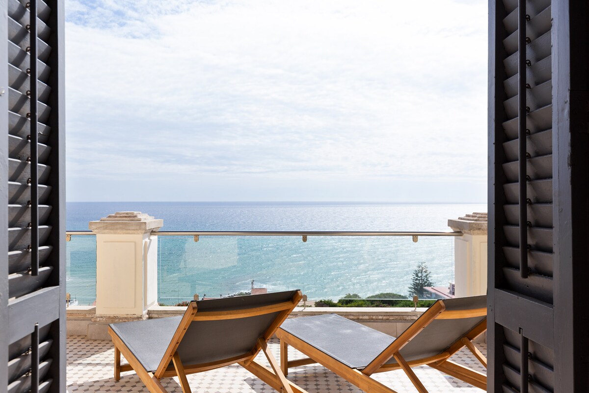 Suite 1 – 2 connected bedrooms (1 shared entrance)– West Wing: 1 King size bed, 1 double bed (or 2 singles), En-suite bathroom with shower, Sitting area, Fan, Wifi Access, Sun terrace with deckchairs, Mountain and sea views