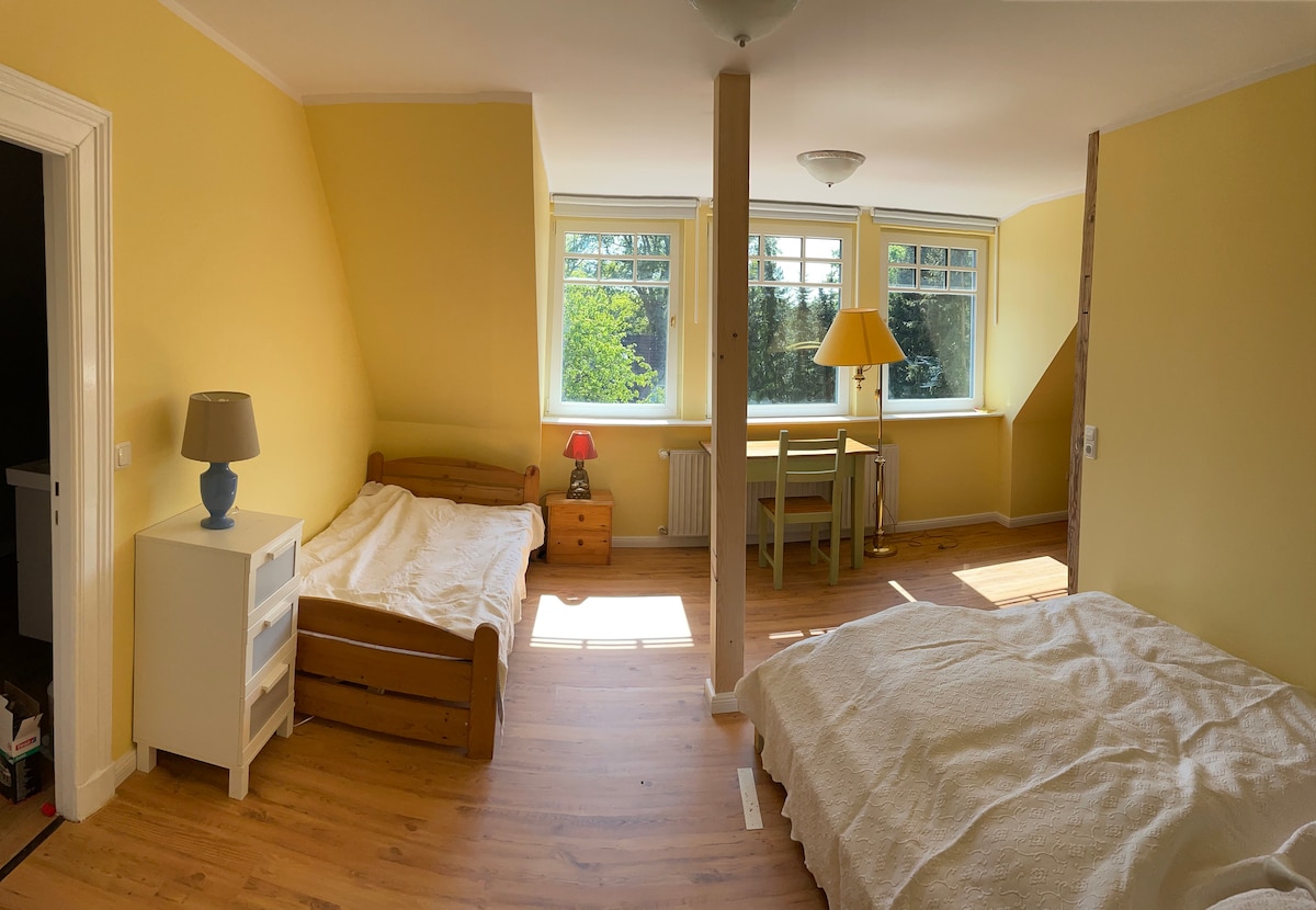 2개의 싱글 침대, 욕실, 간이 주방 및 별도의 출입구가 있는 밝고 아름답게 꾸며진 1인용 아파트가 여러분을 기다리고 있습니다. 이 아파트는 조용한 막다른 골목에 위치하고 있습니다. 아파트는 20평방미터이며 저희는 바로 옆에 살고 있습니다. 퀵보른 역까지 도보로 약 25분(1.7km)이 소요됩니다. 자전거 두 대도 무료로 이용하실 수 있습니다.