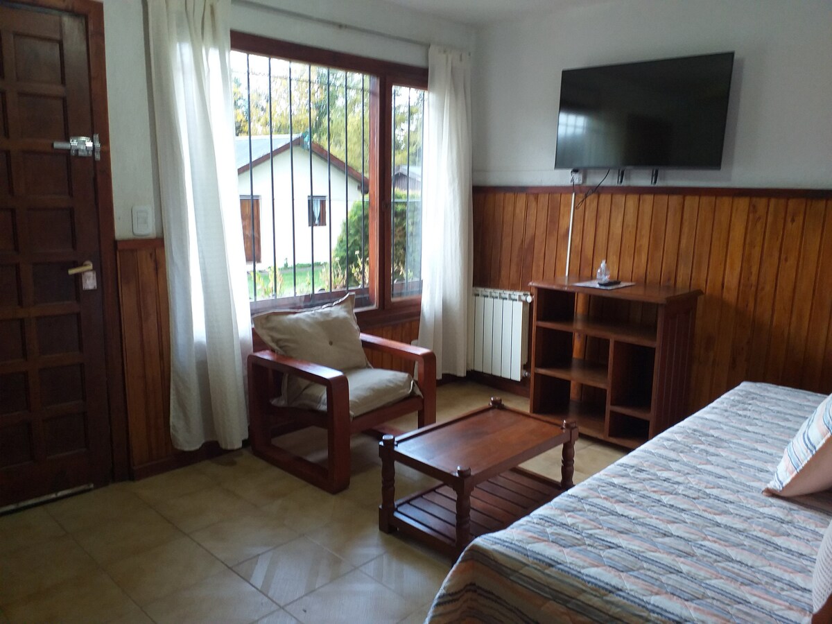 Departamento de 1 habitación para 2 personas en las cercanías del centro de Bariloche. Cuenta con excelente equipamiento de vajillas. TV 40" con Direct TV. WIFI propio del departamento. Baño completo. En las cercanías podrás encontrar quiosco, supermercado, farmacia, panadería, carnicería y fiambrería. Frente al departamento, se encuentra la parada de todas las líneas de colectivos. Balcón. Importante! No se aceptan mascotas ni visitas! Prohibido fumar en todo el ámbito del edificio!