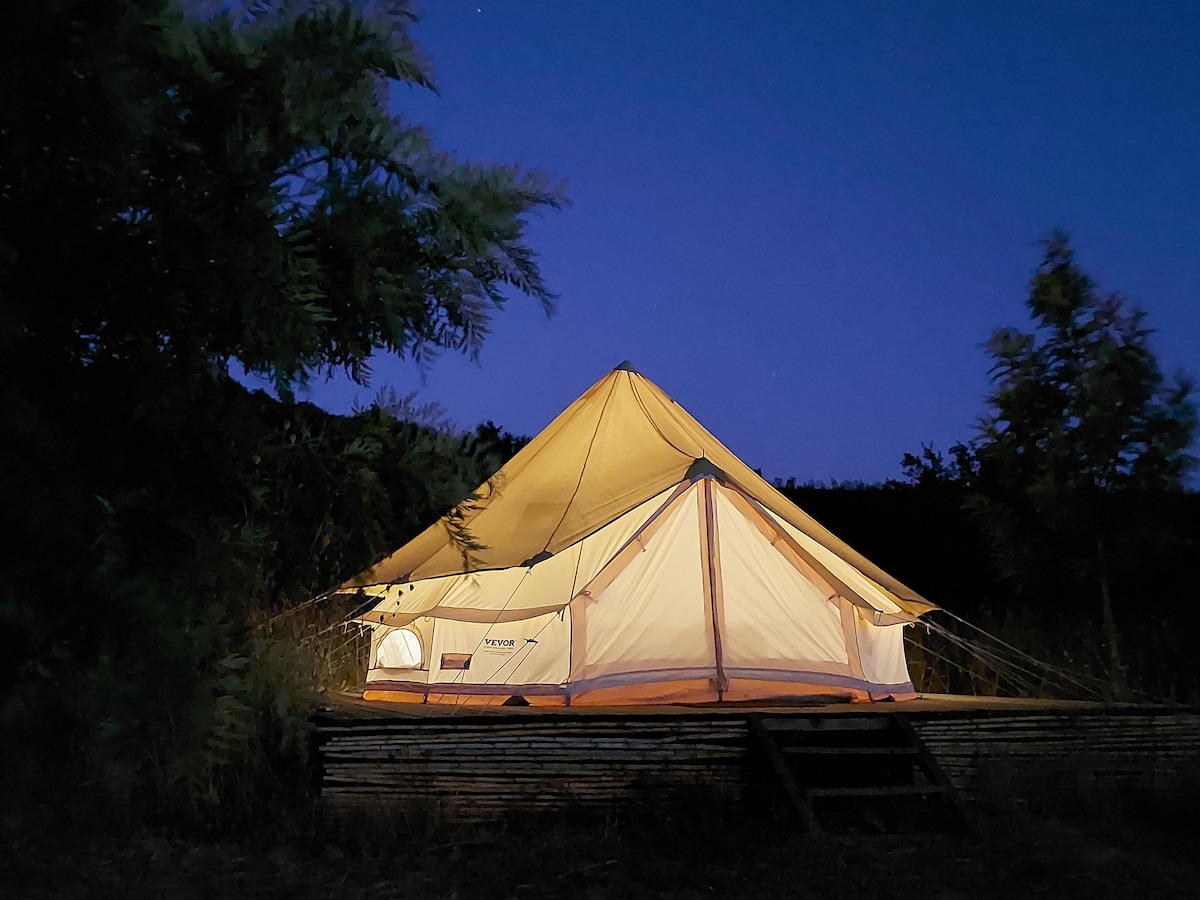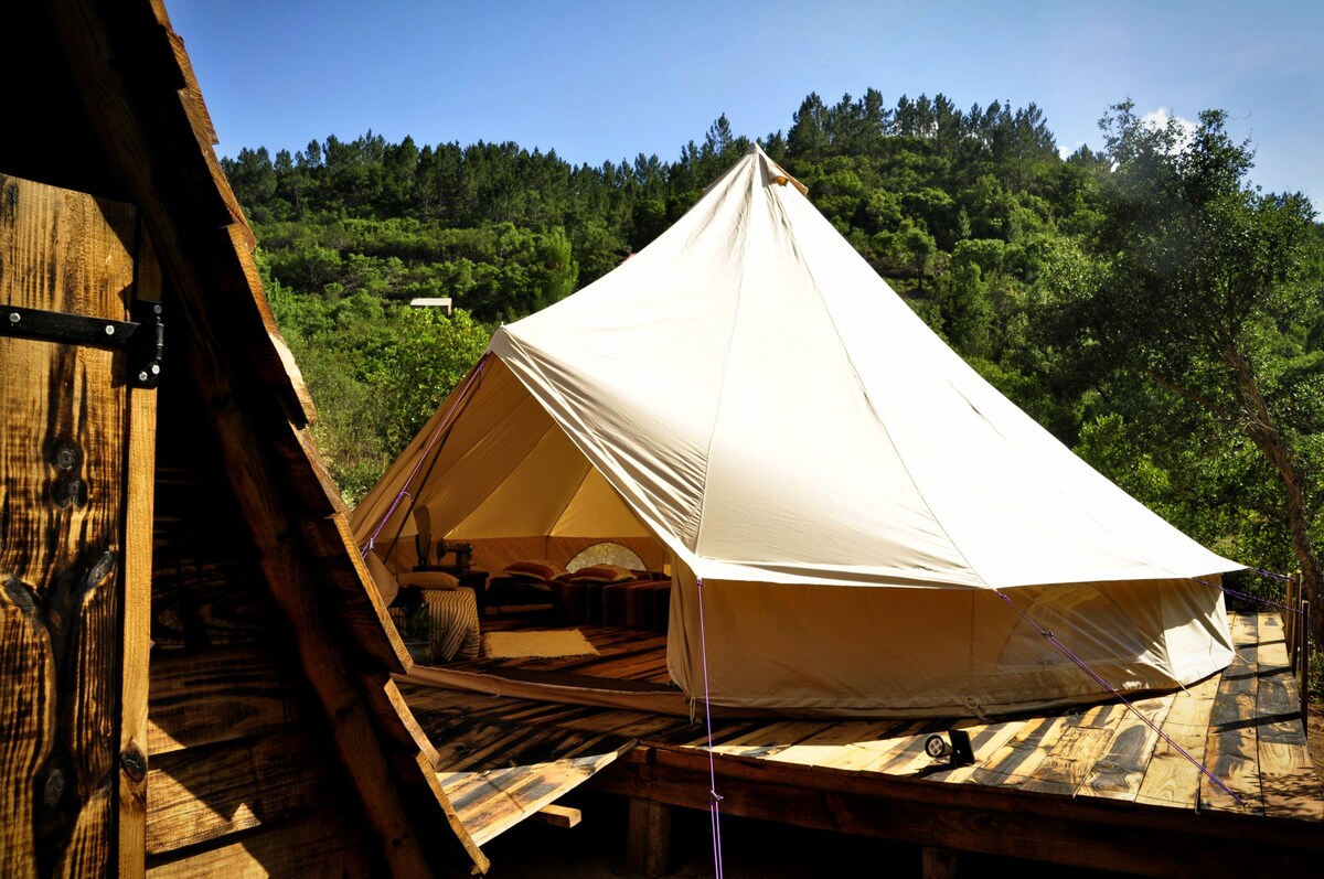 간단한 야외 주방, 태양광 샤워 시설, 친환경 화장실이 있는 아늑하고 가구가 완비된 글램핑 벨 텐트. 몬치케 언덕에 자리 잡고 있으며, 시에라 너머로 남쪽 해안을 내려다볼 수 있는 맑은 전망을 자랑하며, 코르크 참나무와 오렌지 나무로 둘러싸여 있습니다. 숲의 평화와 아름다움을 경험하실 수 있습니다. 단순함과 평화를 즐기러 오세요. 해안의 인파와 더위를 피해보세요. 그림 워크숍, 명상 수업, 물과 주스 단식을 제공합니다. 관심이 있으시면 문의해 주세요.