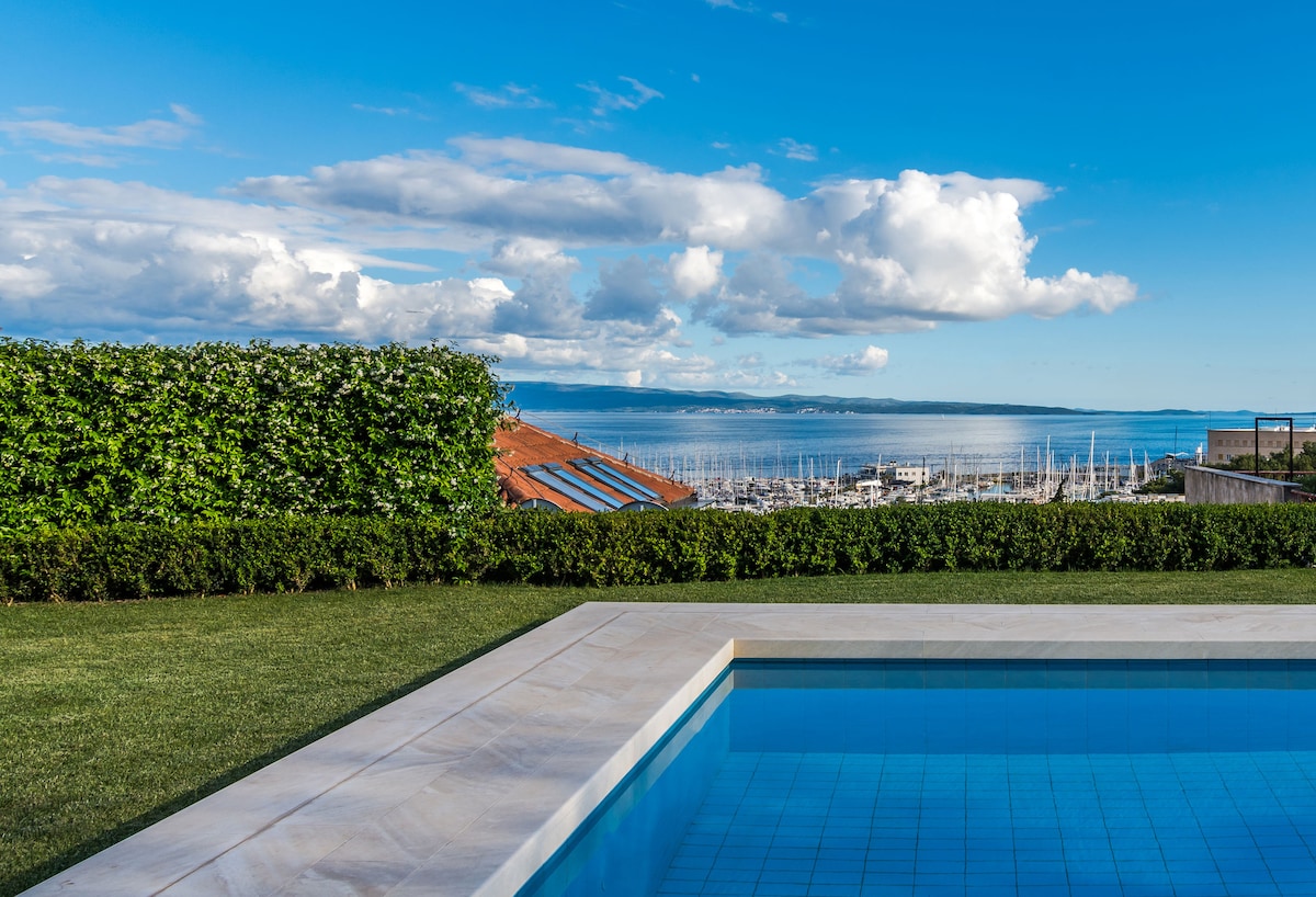 Newly furnished beautiful and modern apartment with stunning sea views, garden and large pool, located just 5 minutes walking distance from Split’s historical center.