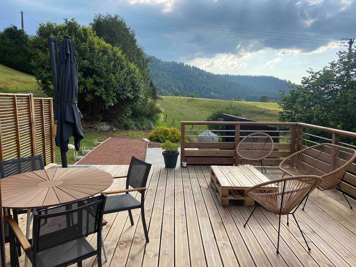 Gîte neuf cocooning de 45 m2 avec Sauna et salle de sport privative 3 étoiles et 3 épis gîte de France, idéal pour deux personnes, (entrée et accès indépendants sans vis à vis ) avec une vue panoramique époustouflante depuis votre terrasse privative sur la vallée de Cleurie et sur le village du Tholy. Situé à 700 m d'altitude dans un site très calme sur le hauteurs du Tholy, au coeur des Hautes Vosges. A proximité immédiate de la forêt, de nombreux sentiers de randonnées et de circuits VTT.
