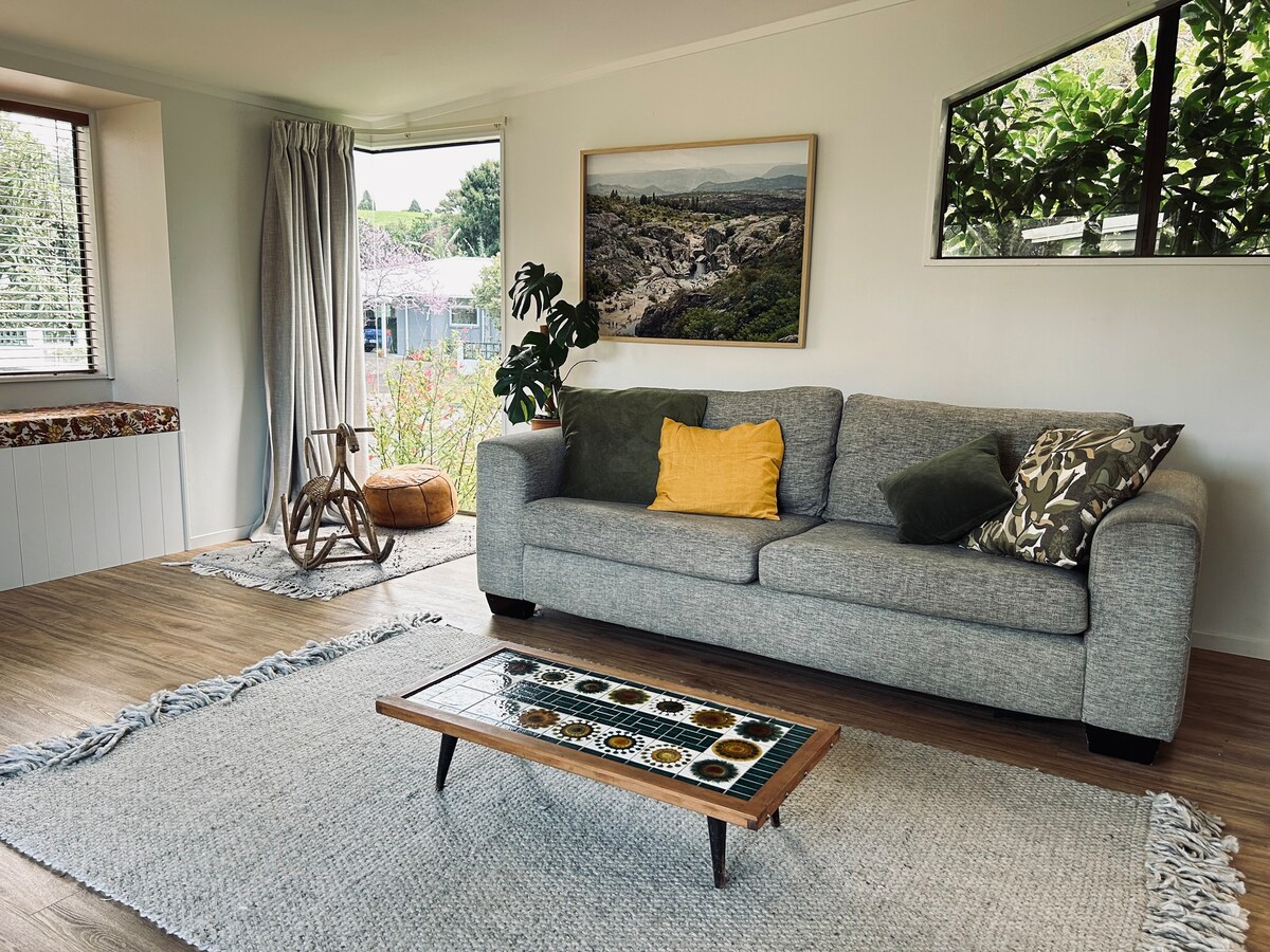 완전히 개조된 울타리 둘러싸인 아늑한 전원주택과 3번째 침실로 사용할 수 있는 캠핑카, 7명 이상 예약 시 사용할 수 있는 캠핑카 바로 옆에 위치한 작은 오두막에 욕실이 있습니다. 숙소는 강 바로 옆에 위치하고 있으며, 호수로 이어지는 작은 시골 도로에 있습니다. 현관문 바로 앞에 있는 타우랑가-타우포 강에서 송어 낚시를 즐길 수 있습니다. 바흐 소유자와 소수의 영주 거주자로 구성된 친절한 작은 커뮤니티