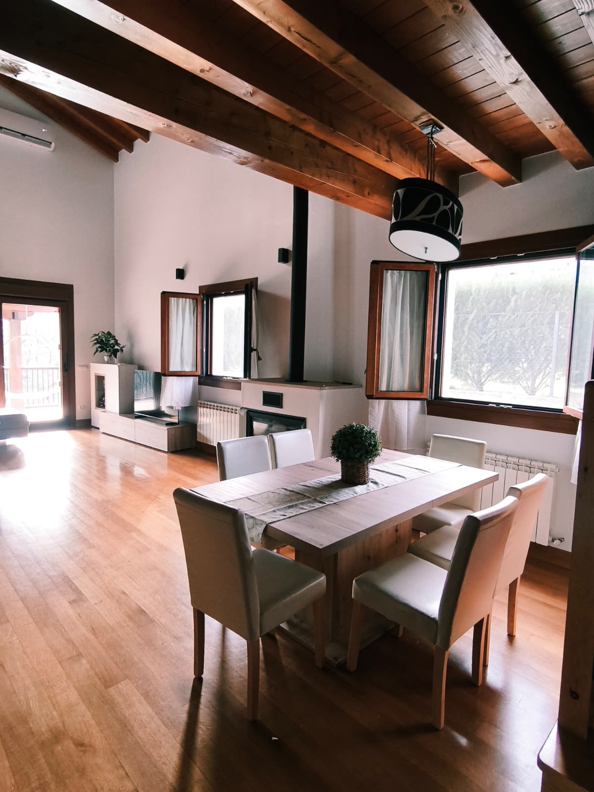 나바라 북부의 숲과 푸른 산으로 둘러싸인 조용한 아도사도. 완비된 주방, 벽난로가 있는 거실, 욕실 2개, 침실 3개(침대 5개)가 있습니다. 발코니와 테이블, 의자, 파라솔, 해먹이 있는 남향 테라스. 차량이 현관문에 주차되어 있습니다. 진입로를 통해 모든 유형의 차량이 도착할 수 있습니다.
